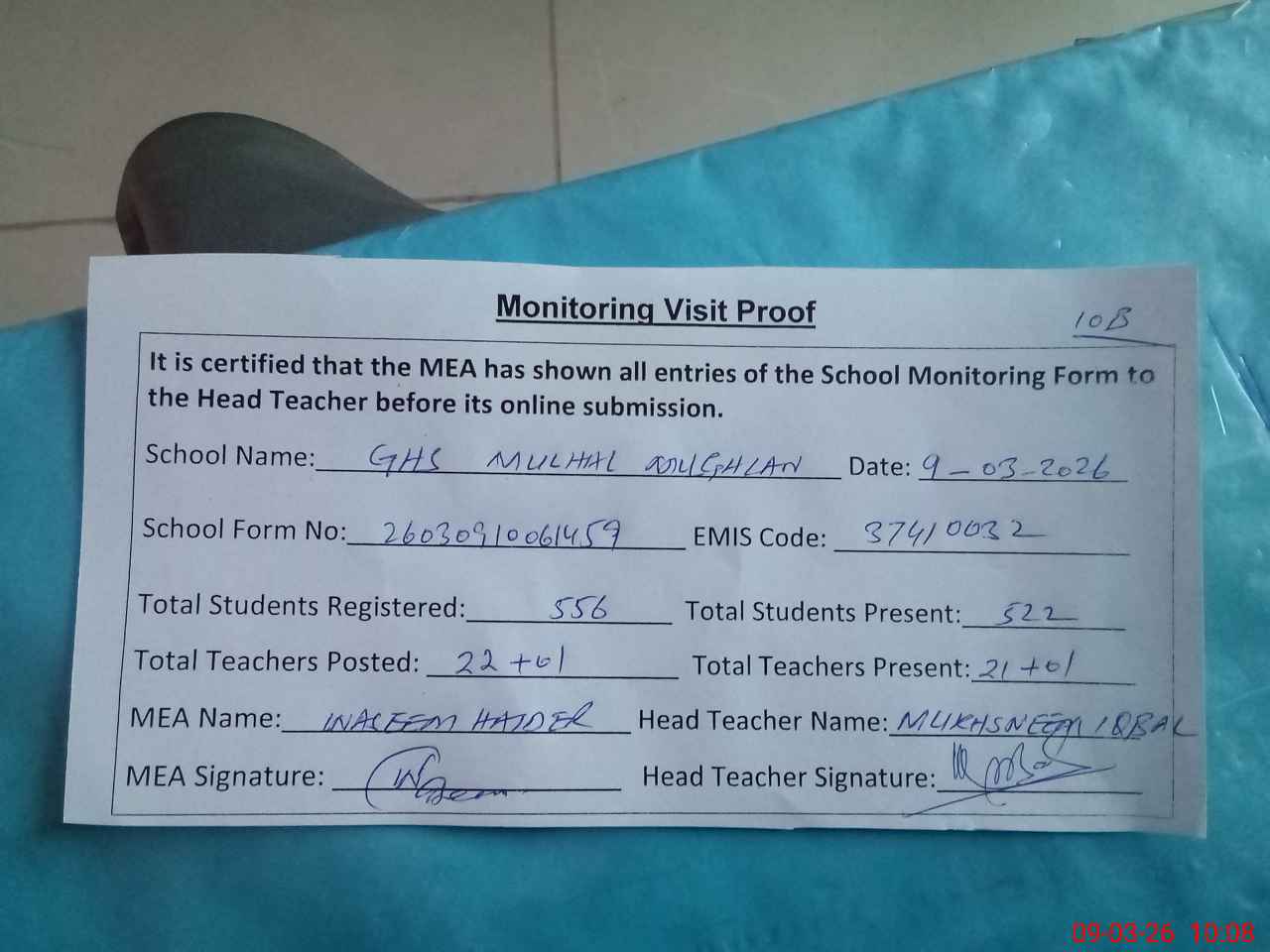 | Attendance Register | Head Teacher | MEA with School | Visit Proof |