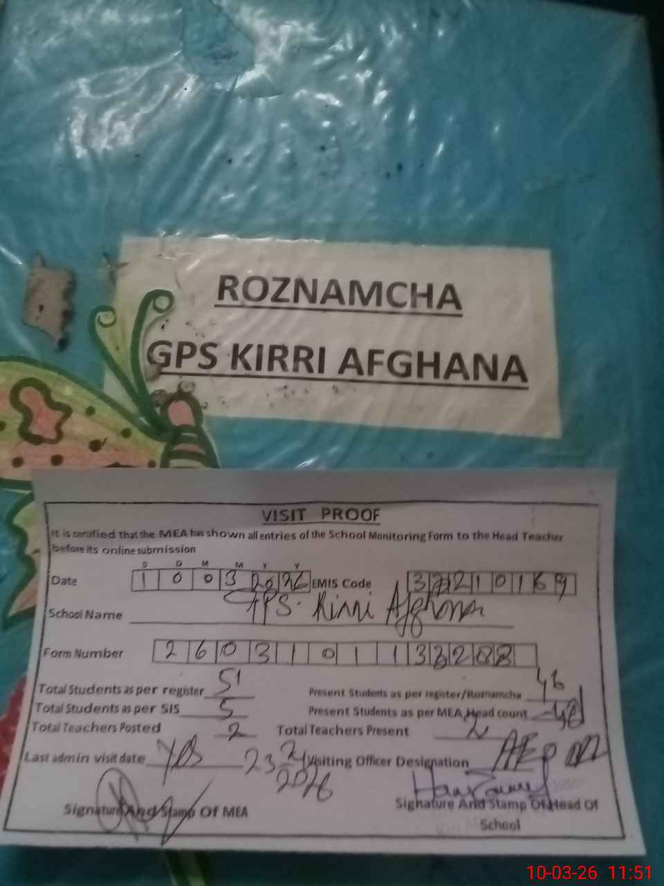 | EMIS Code: 37210169 | Name of School: GPS KIRRI AFGHANA | |||