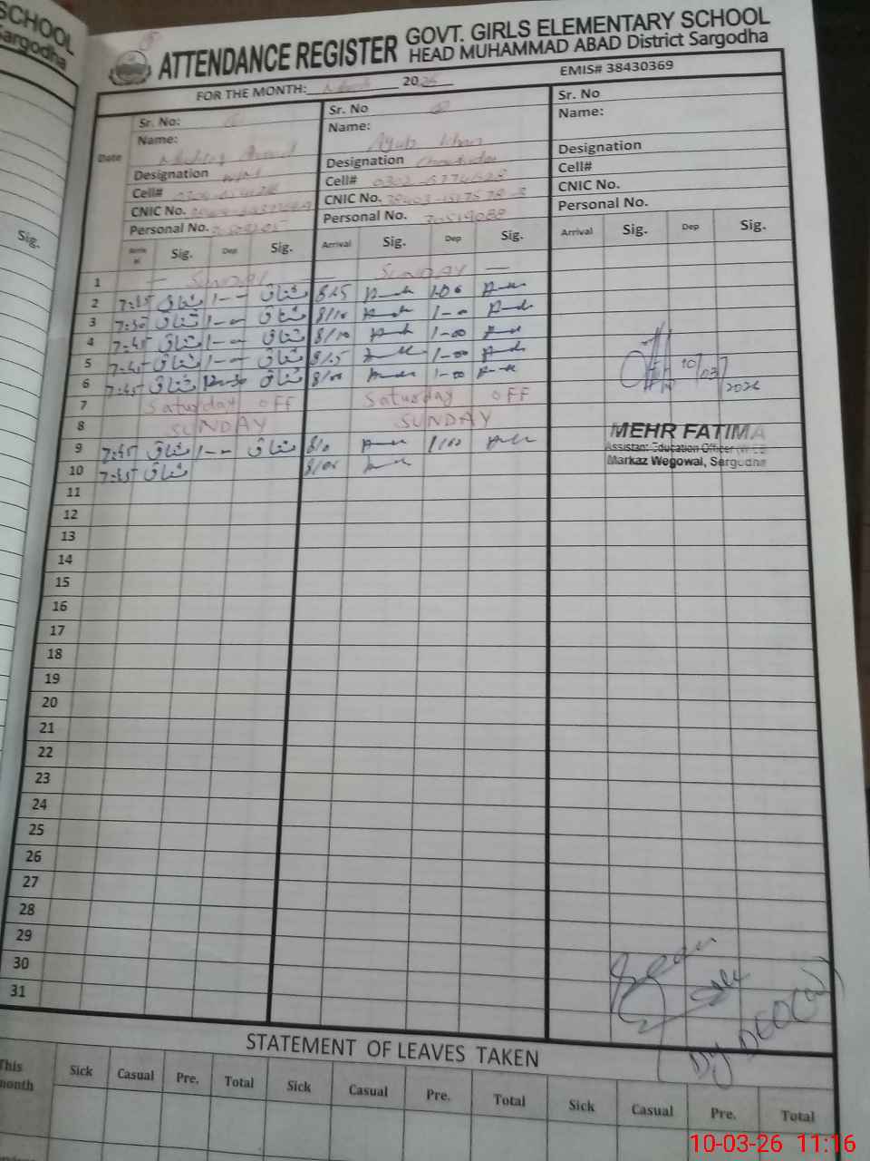 | Name: ME**** KA**** Designation: (School Headmaster's/Headmistress's) SSE (SCIENCE) Phone/Cell Number: 03**** |