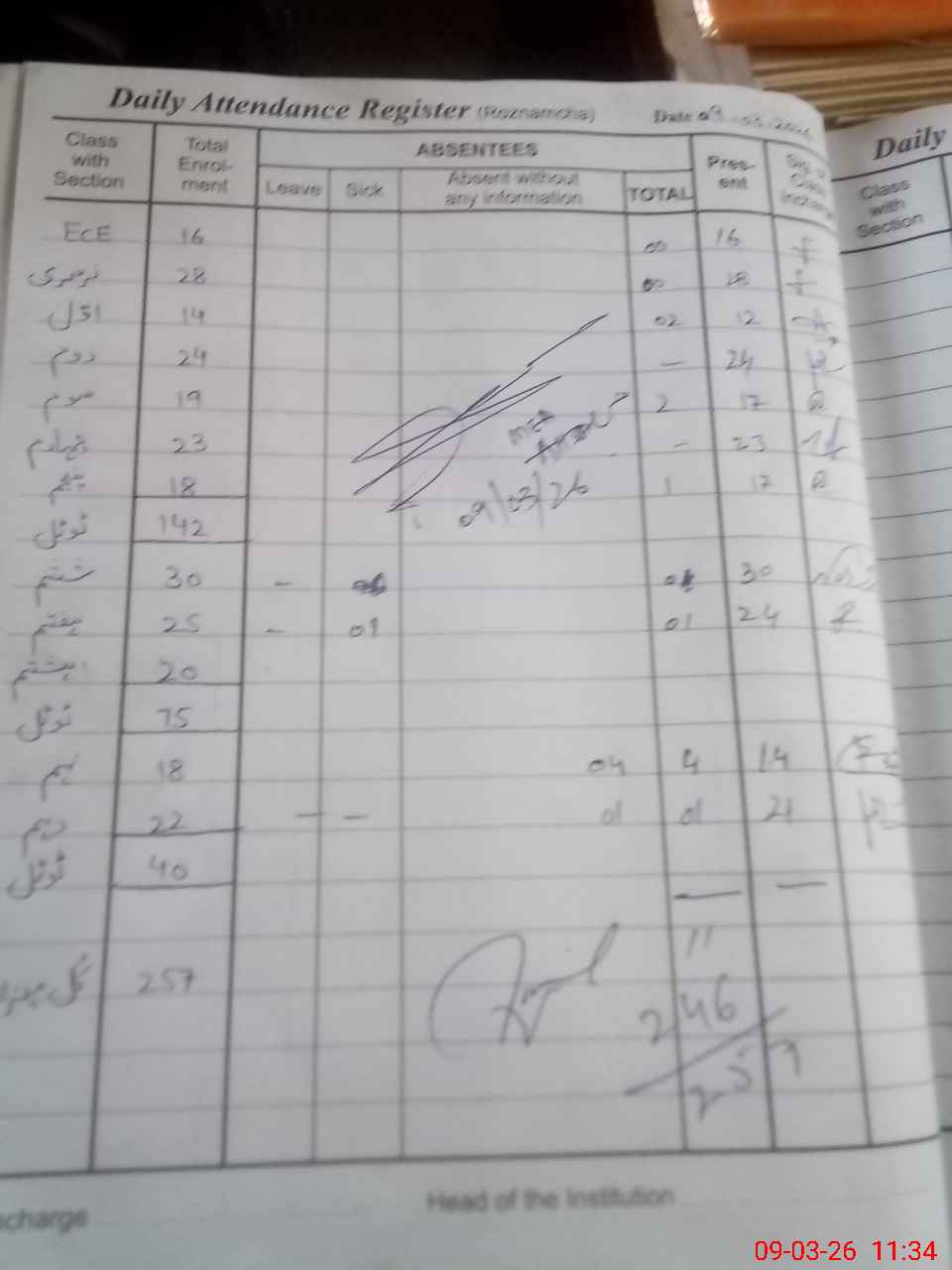 | No. of Students Present - Male | 0 | 16 | 12 | 24 | 17 | 23 | 17 | 30 | 24 | 20 | 14 | 21 | 246 | |||