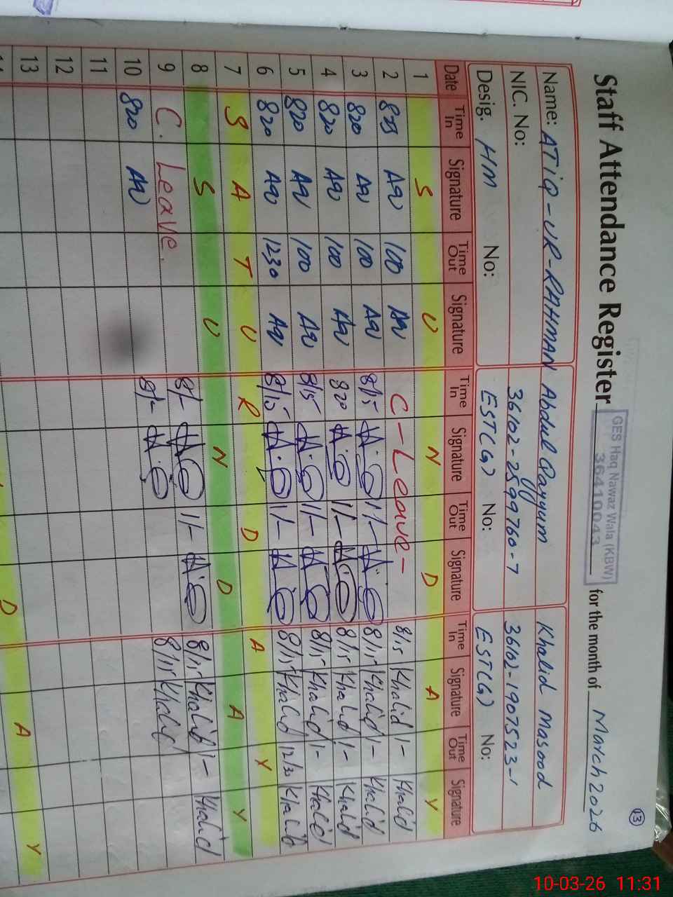 | CNIC | Full Name | Designation | R/C | Absence During Last Calender Month |