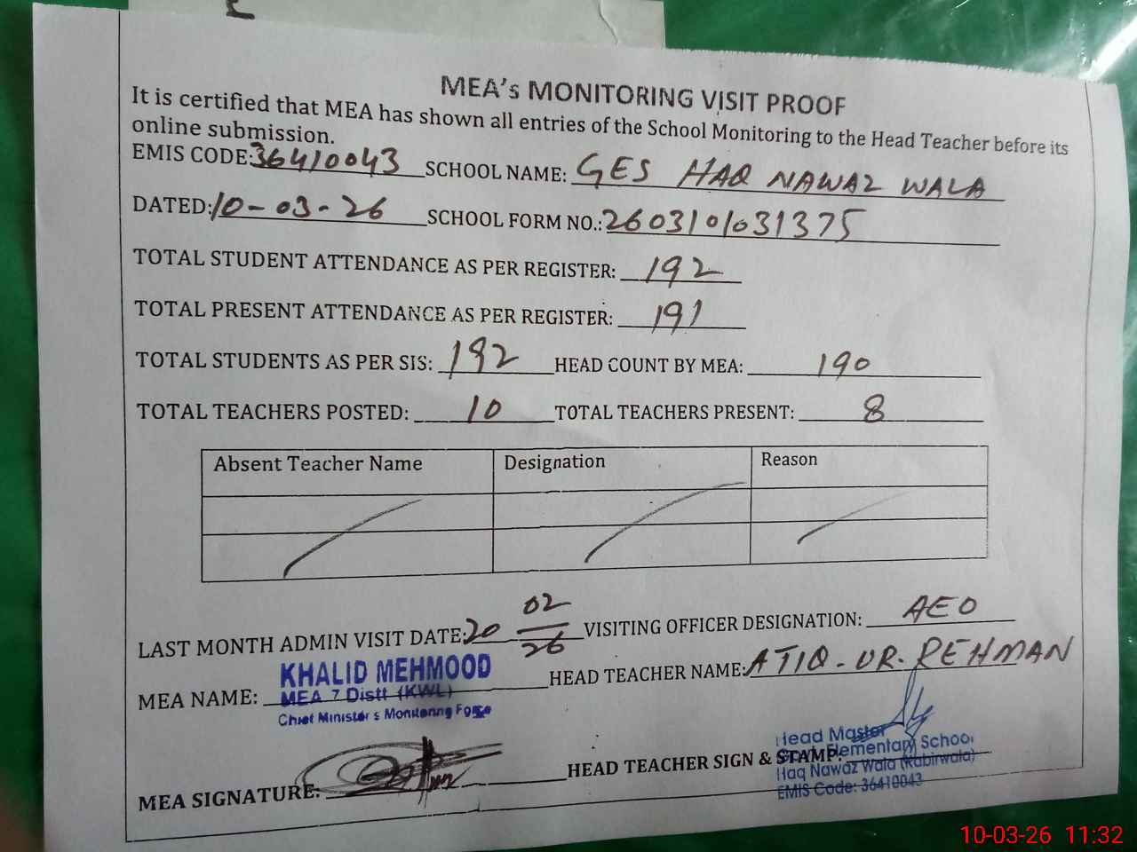 | Attendance Register | Head Teacher | MEA with School | Visit Proof |