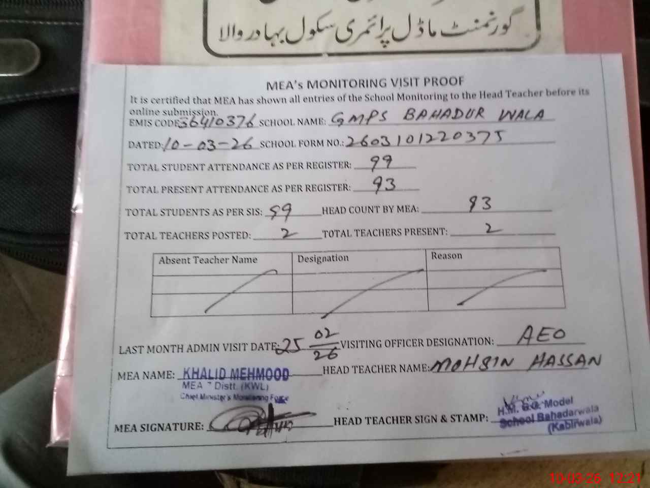 | EMIS Code: 36410376 | Name of School: GMPS BAHADUR WALA, KABIRWALA | |||