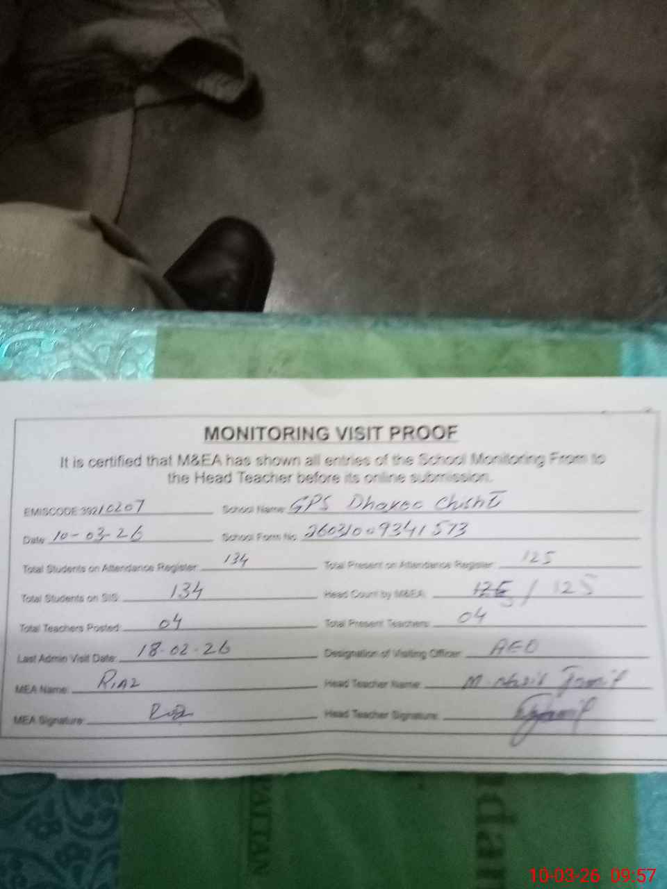 | Attendance Register | Head Teacher | MEA with School | Visit Proof |