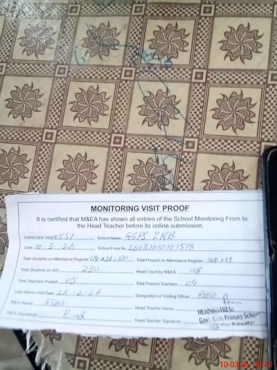 | Attendance Register | Head Teacher | MEA with School | Visit Proof |
