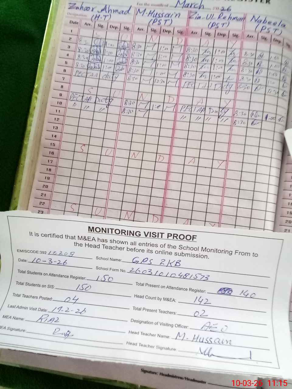 | Attendance Register | Head Teacher | MEA with School | Visit Proof |