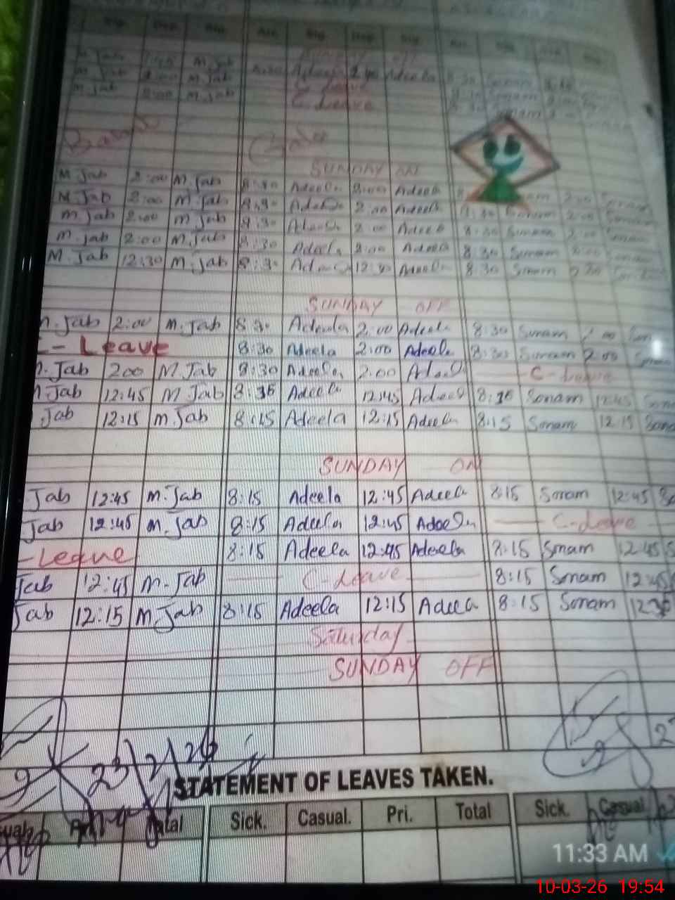 | Leave | Duty | Absent | Maternity | Medical | Ex- Pak |