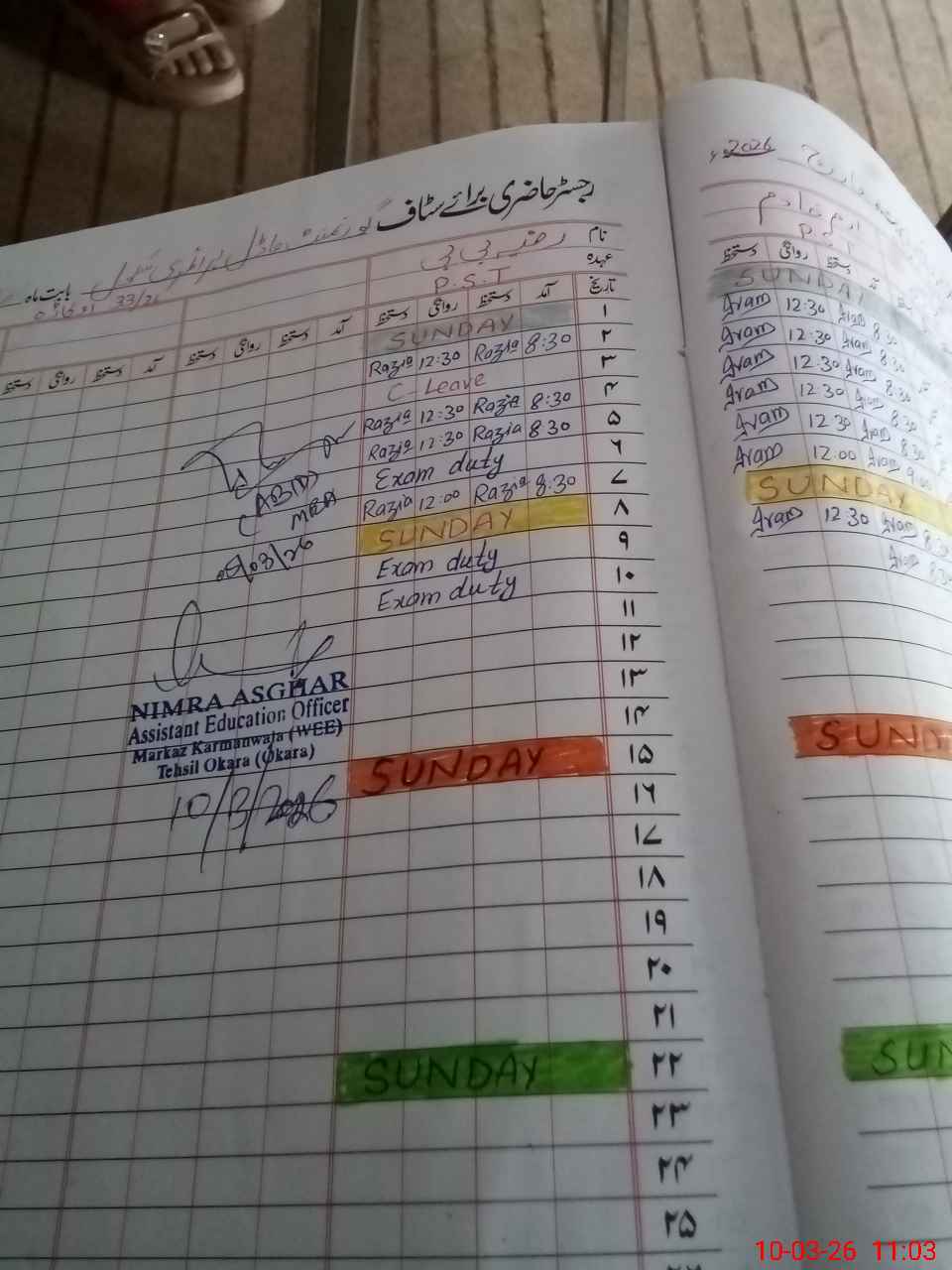 | 35**** | Ra**** Bi**** | PST Arts | Regular | 0 | 0 | 0 | 0 | 0 | 0 | 0 | 0 | 0 | Exam Duty |