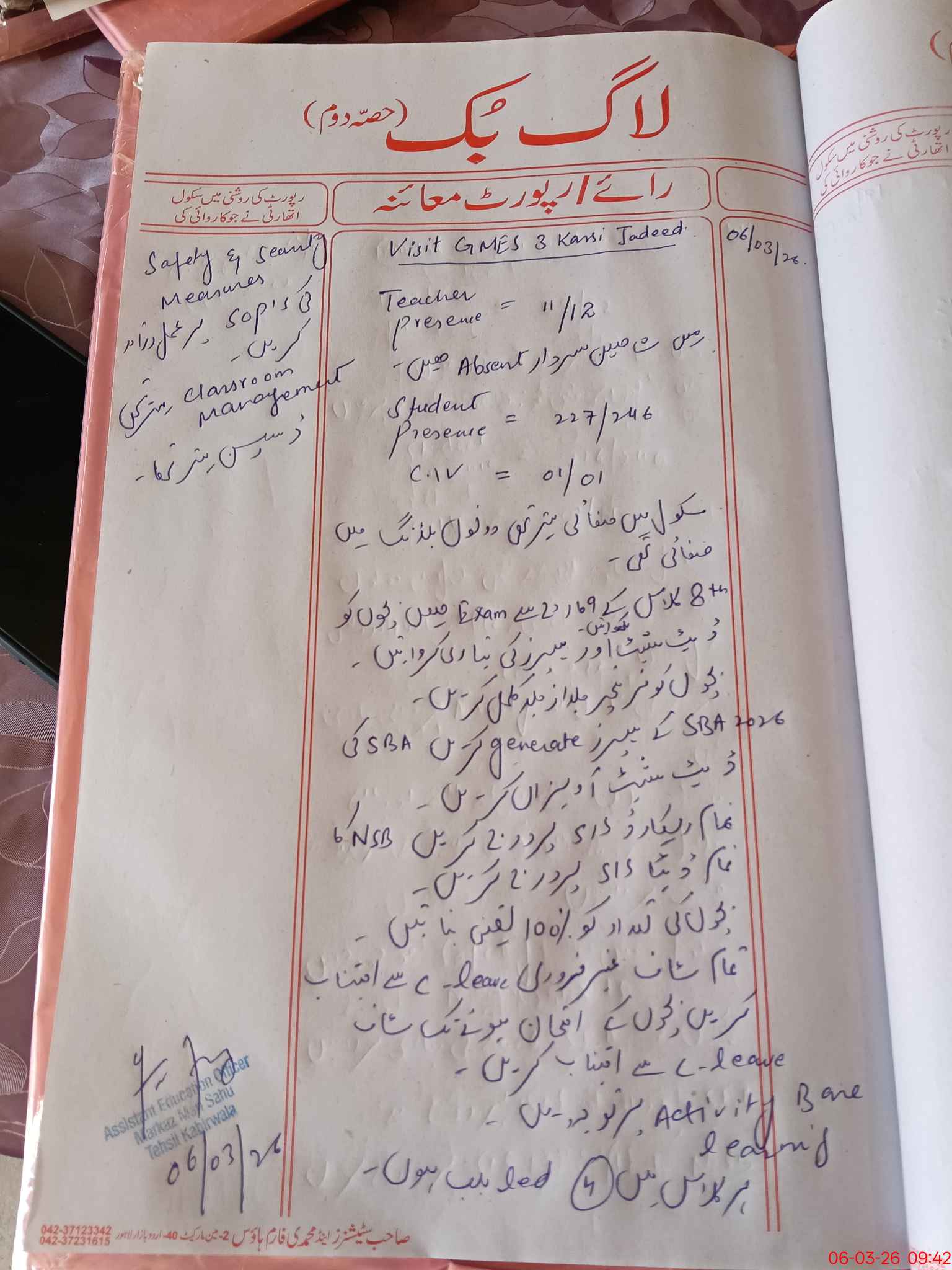 | Certified that this School was Inspected by the Undersigned MEA/DMO Today and the Information Stated Above is as Per Record. | |||||