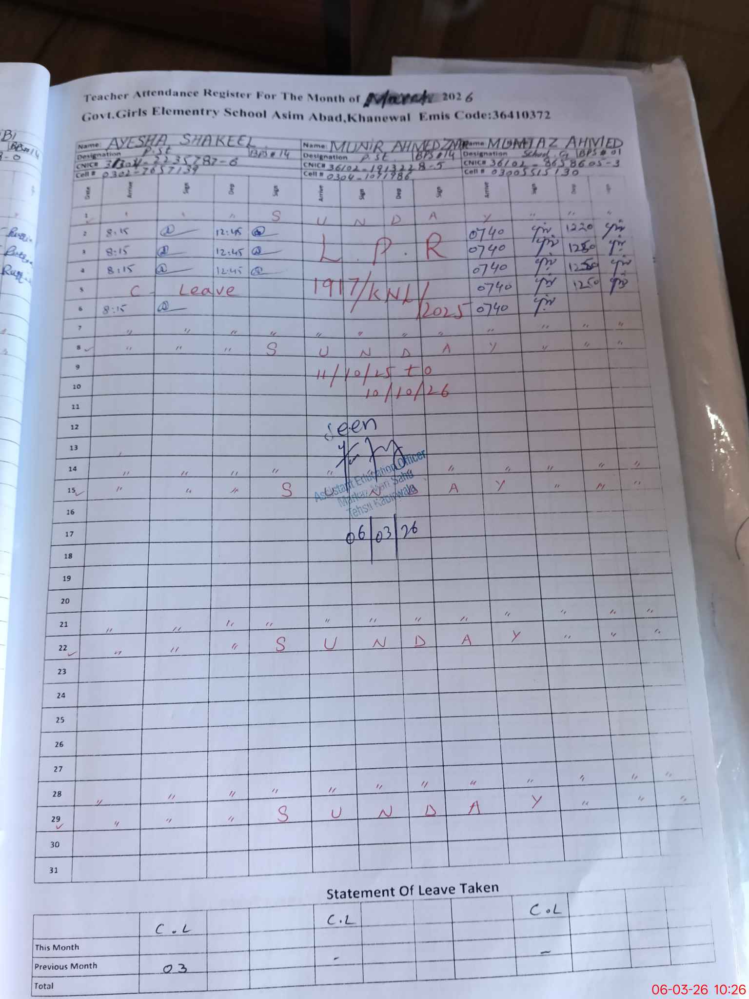 | CNIC | Full Name | Designation | R/C | Absence During Last Calender Month |