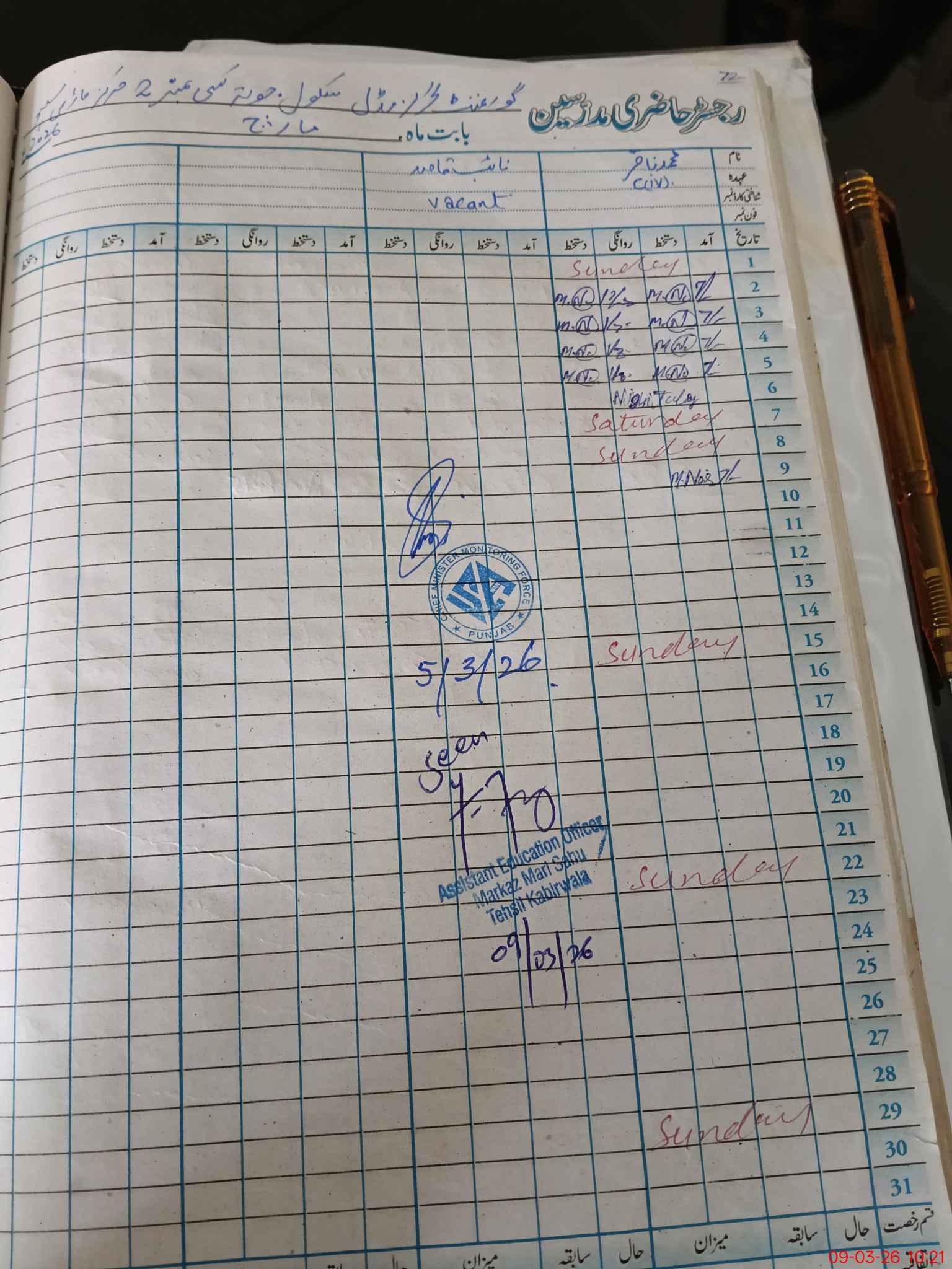| Monitoring Date: 09-03-2026 | Start Time: 09-03-2026 09:31 AM | End Time: 09-03-2026 10:30 AM | Name of MEA: YA**** AS**** | |