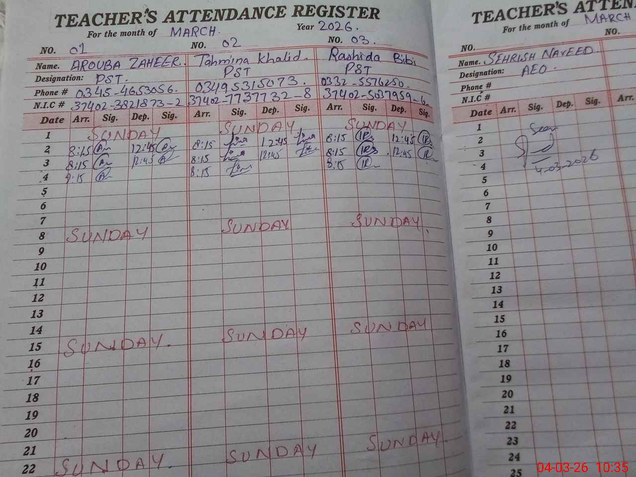| CNIC | Full Name | Designation | R/C | Absence During Last Calender Month |