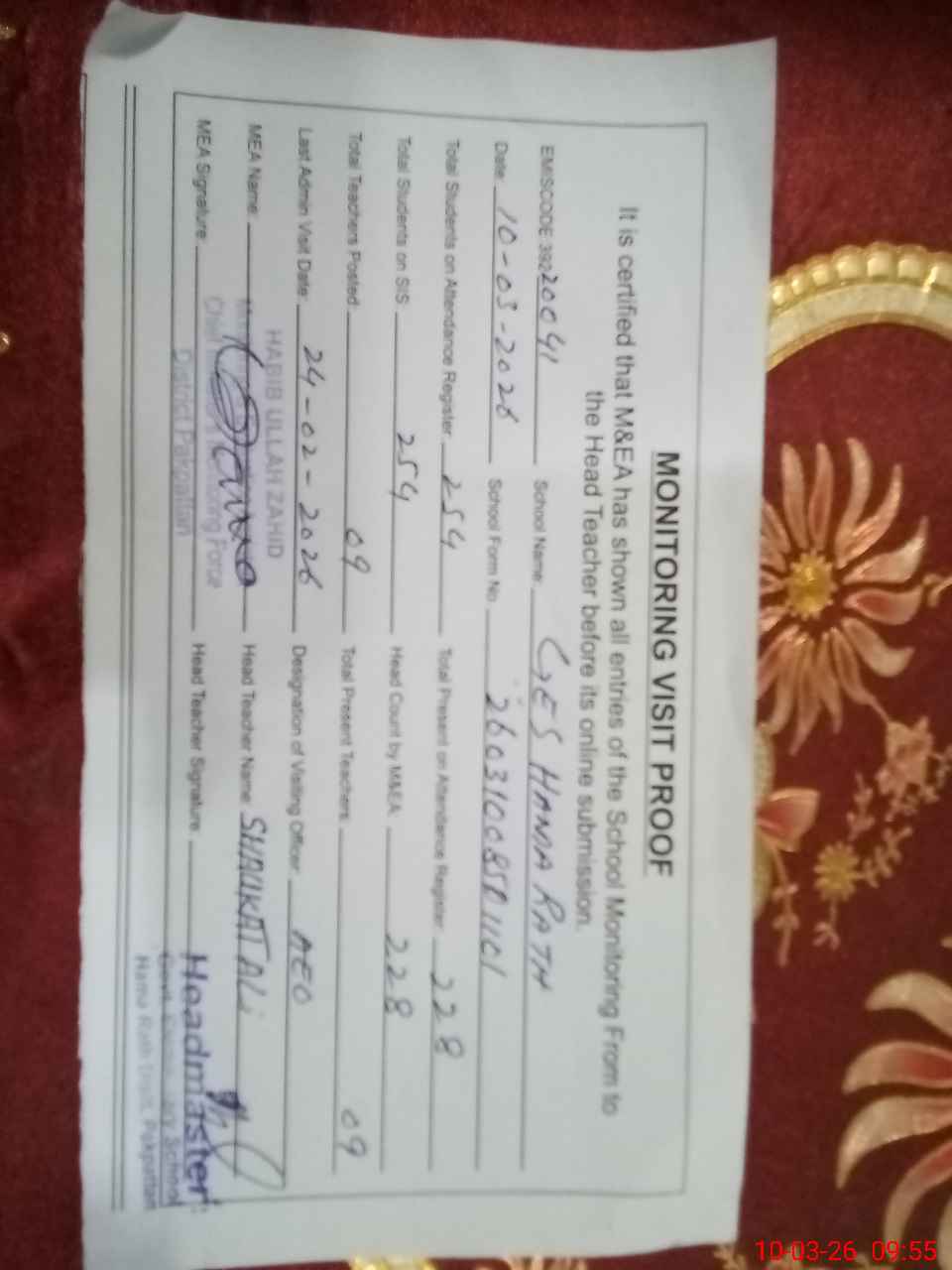 | Certified that this School was Inspected by the Undersigned MEA/DMO Today and the Information Stated Above is as Per Record. | |||||