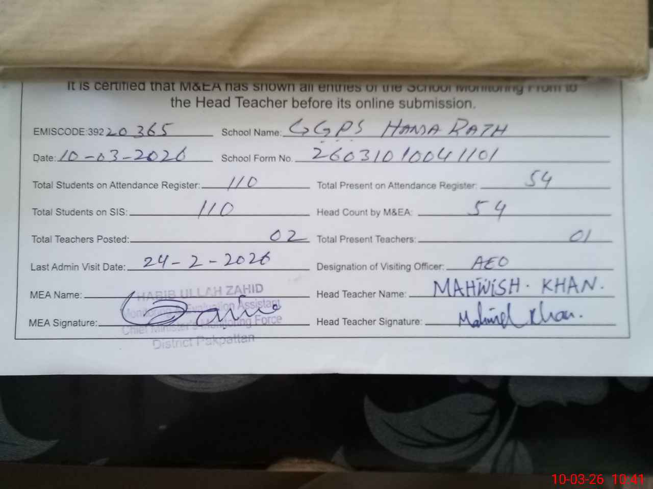 | Certified that this School was Inspected by the Undersigned MEA/DMO Today and the Information Stated Above is as Per Record. | |||||