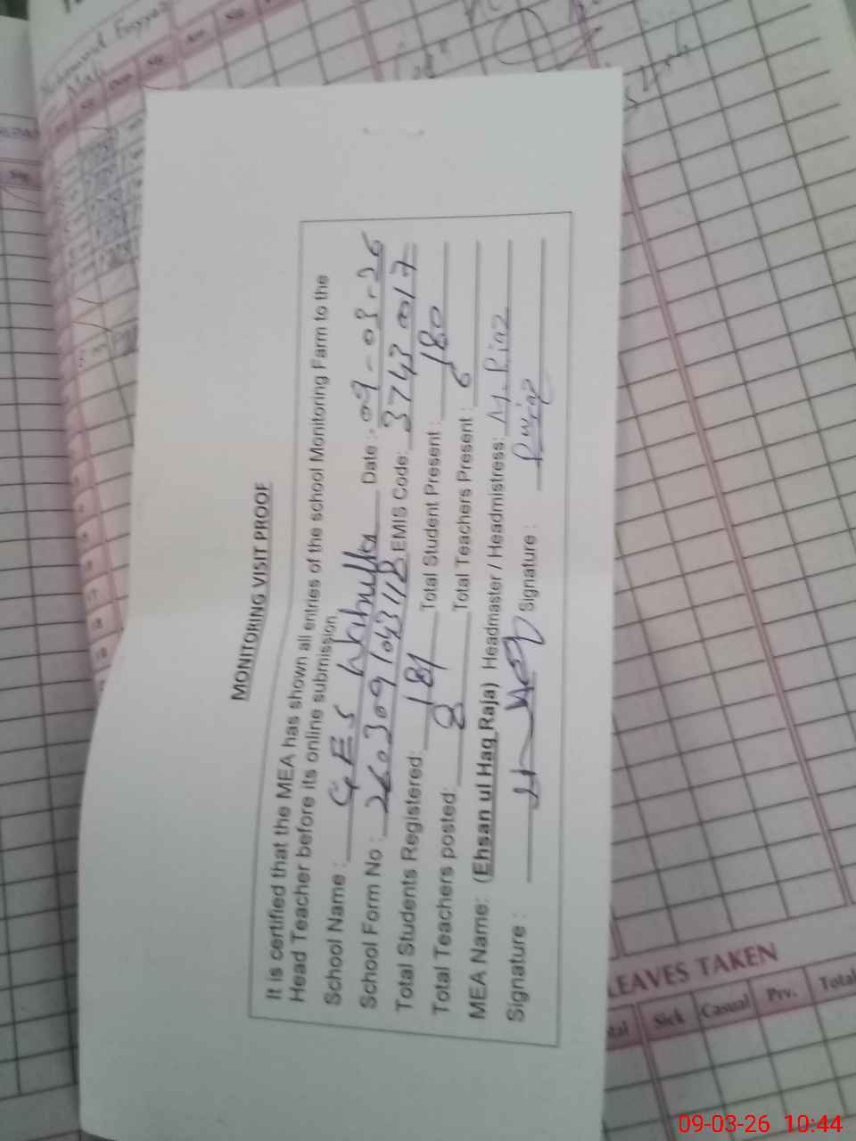 | Attendance Register | Head Teacher | MEA with School | Visit Proof |