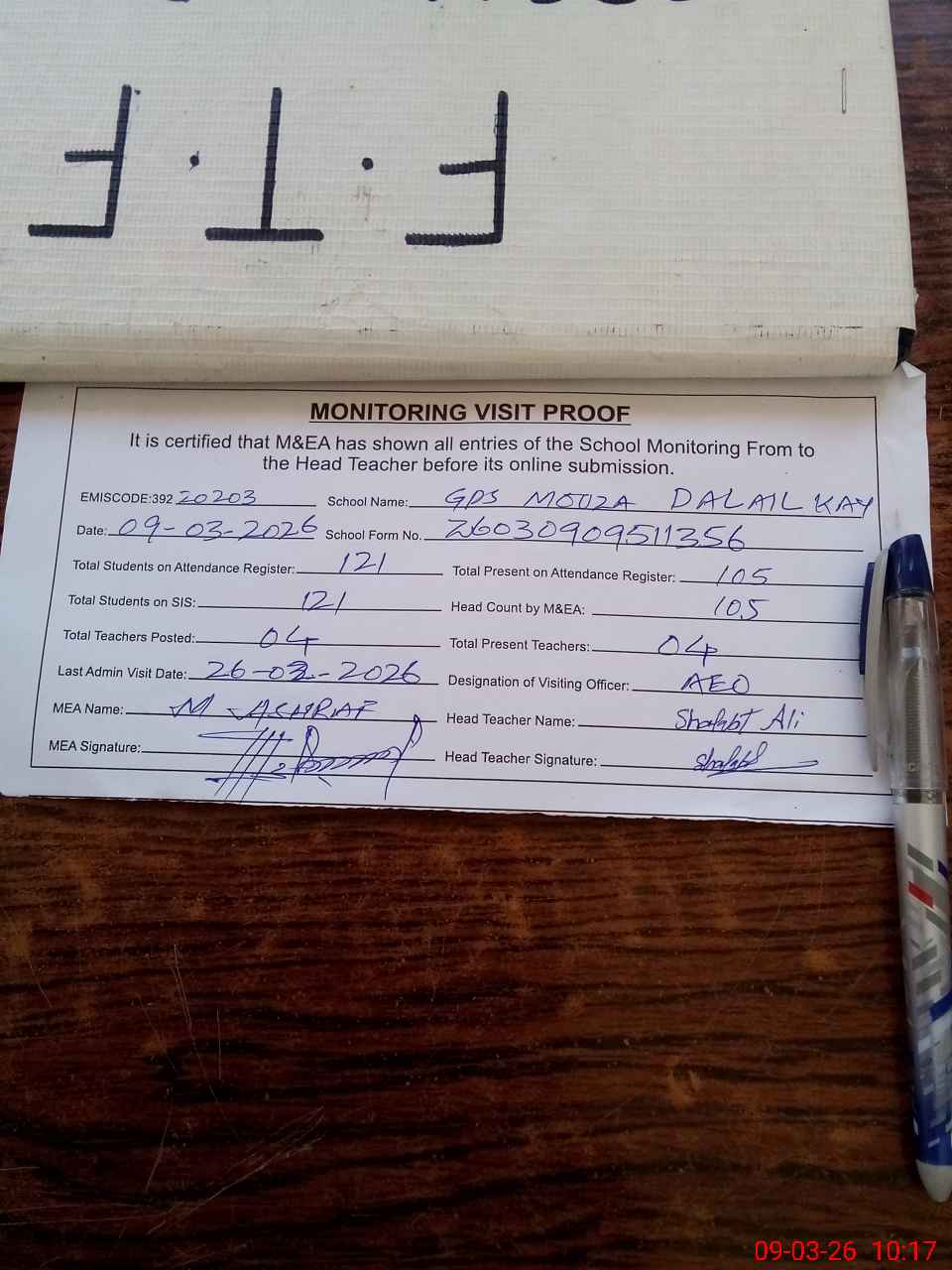 | Attendance Register | Head Teacher | MEA with School | Visit Proof |