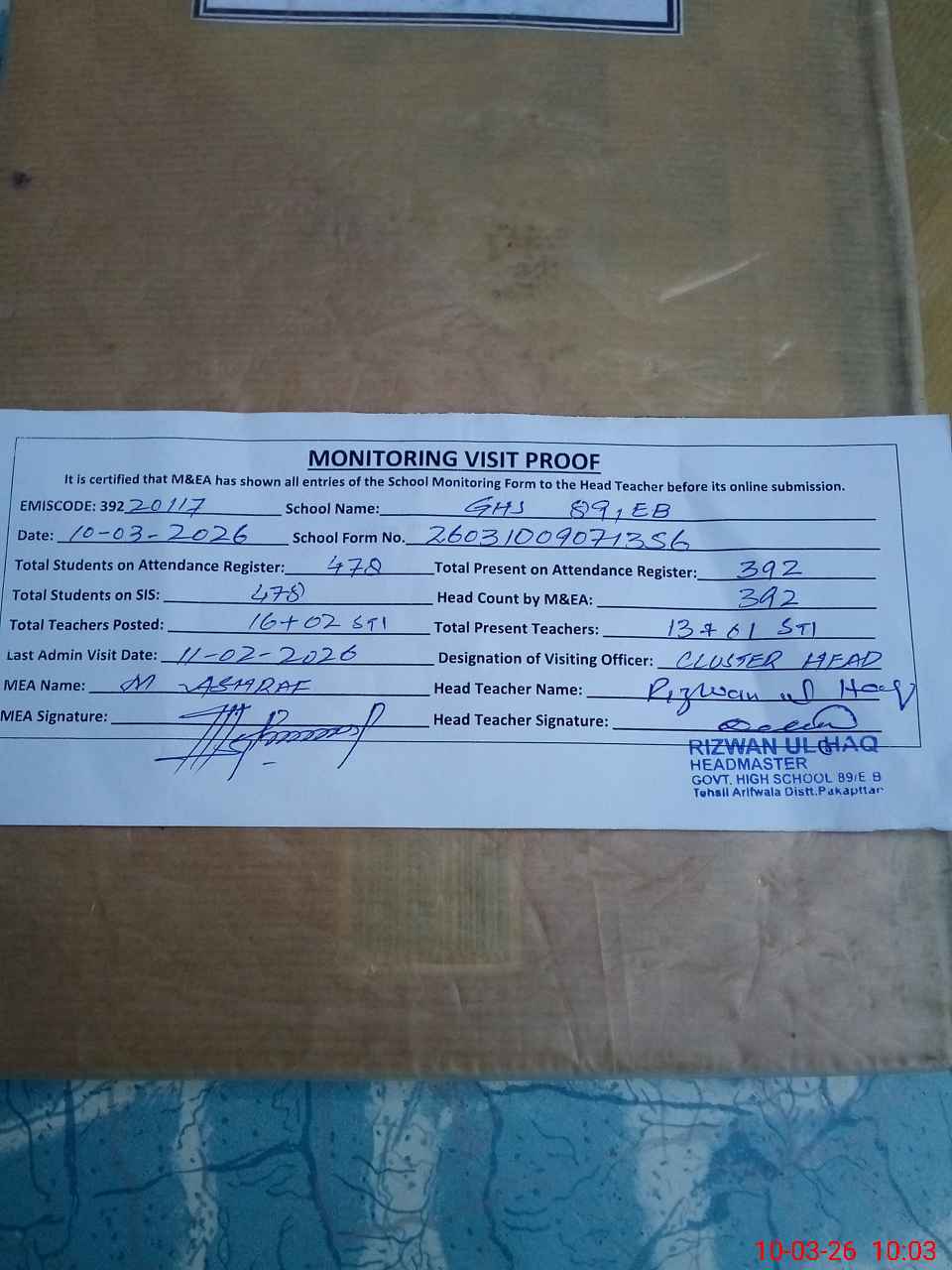 | EMIS Code: 39220117 | Name of School: GHS CHAK NO. 89 EB | |||