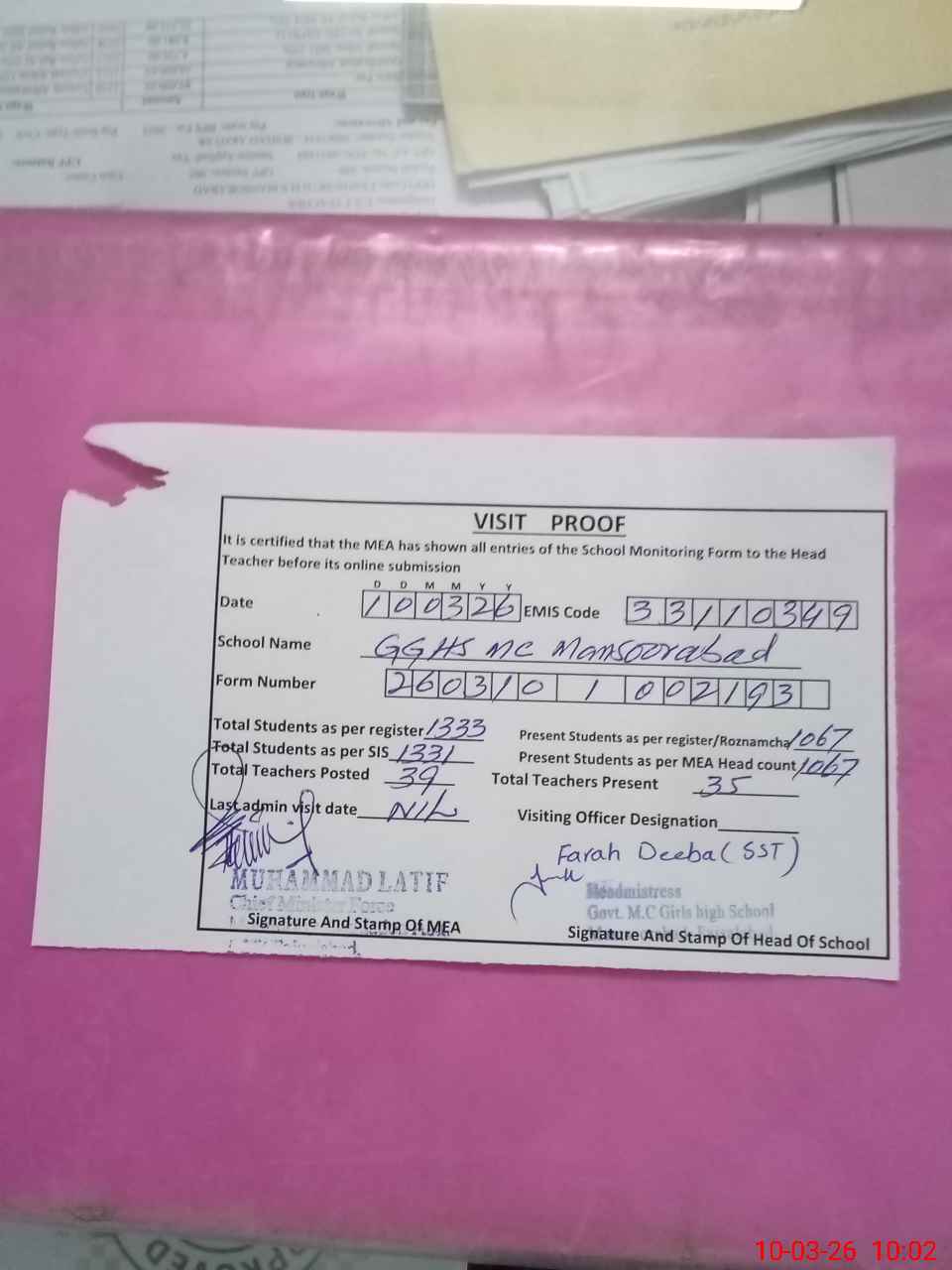 | EMIS Code: 33110349 | Name of School: GGHS MC MANSOOR ABAD FAISALABAD | |||
