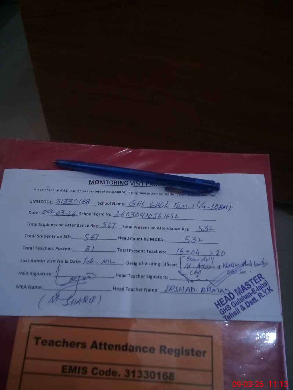 | Attendance Register | Head Teacher | MEA with School | Visit Proof |