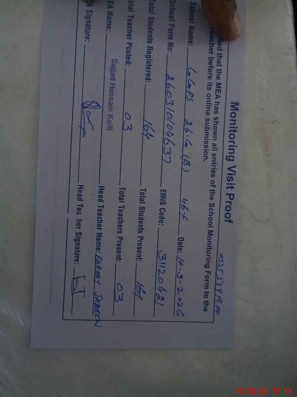 | EMIS Code: 31120421 | Name of School: GGPS CHAK NO. 26/ B | |||