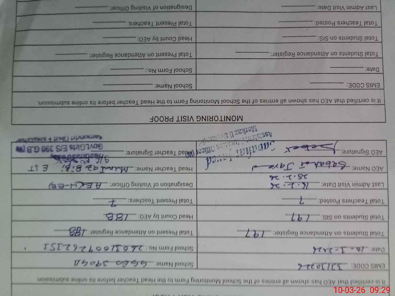 | Certified that this School was Inspected by the Undersigned MEA/DMO Today and the Information Stated Above is as Per Record. | |||||