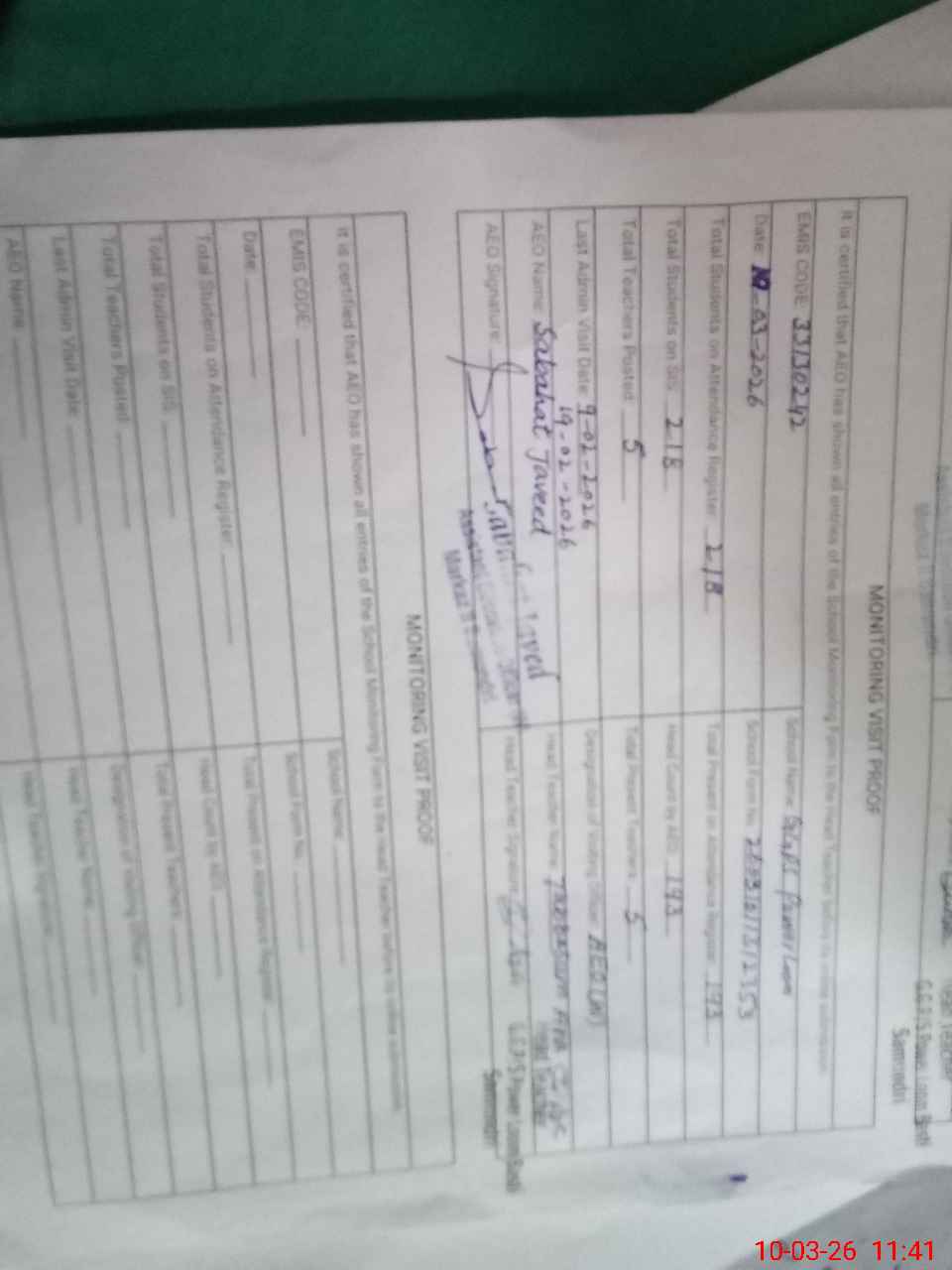 | Certified that this School was Inspected by the Undersigned MEA/DMO Today and the Information Stated Above is as Per Record. | |||||
