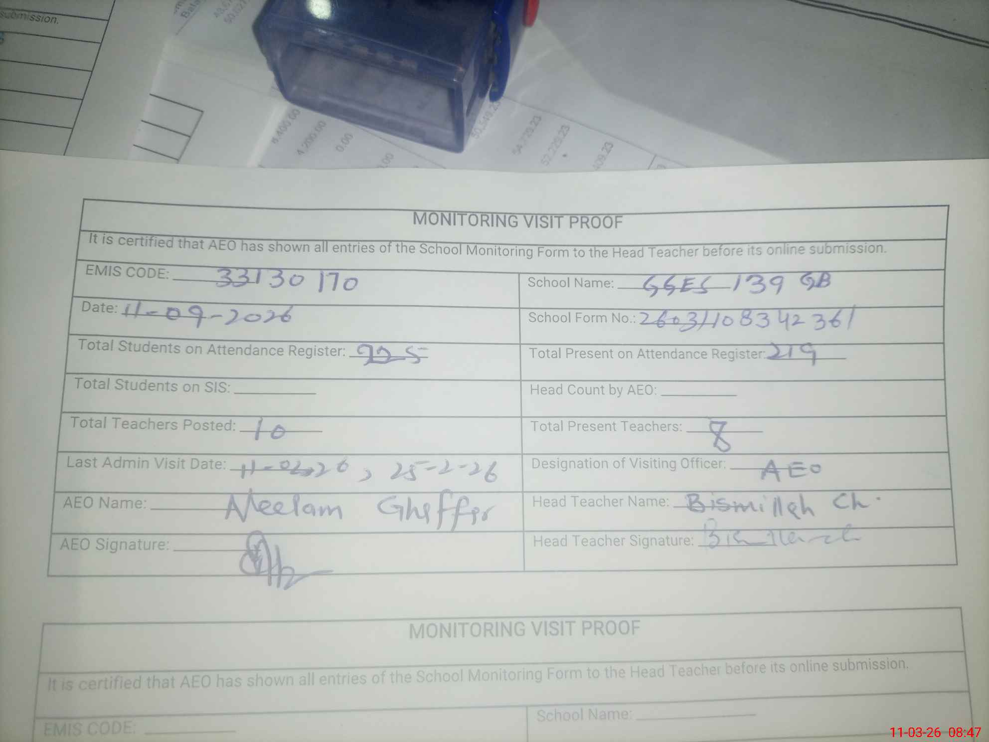 | Attendance Register | Head Teacher | MEA with School | Visit Proof |