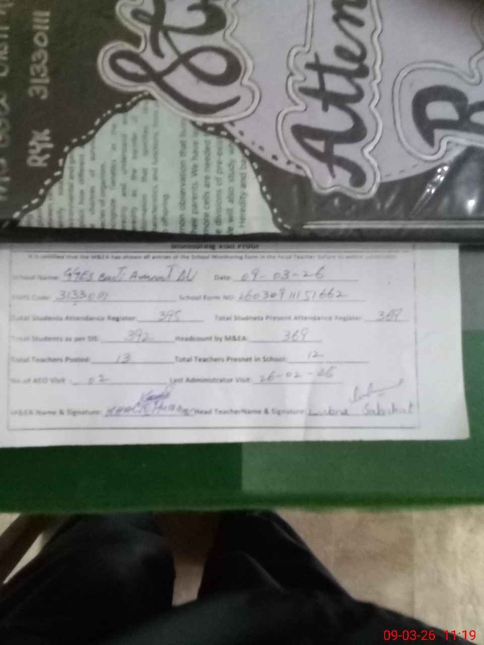 | Attendance Register | Head Teacher | MEA with School | Visit Proof |
