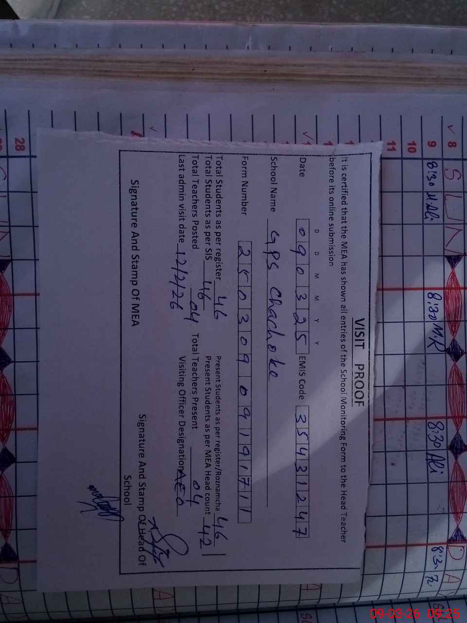 | Attendance Register | Head Teacher | MEA with School | Visit Proof |
