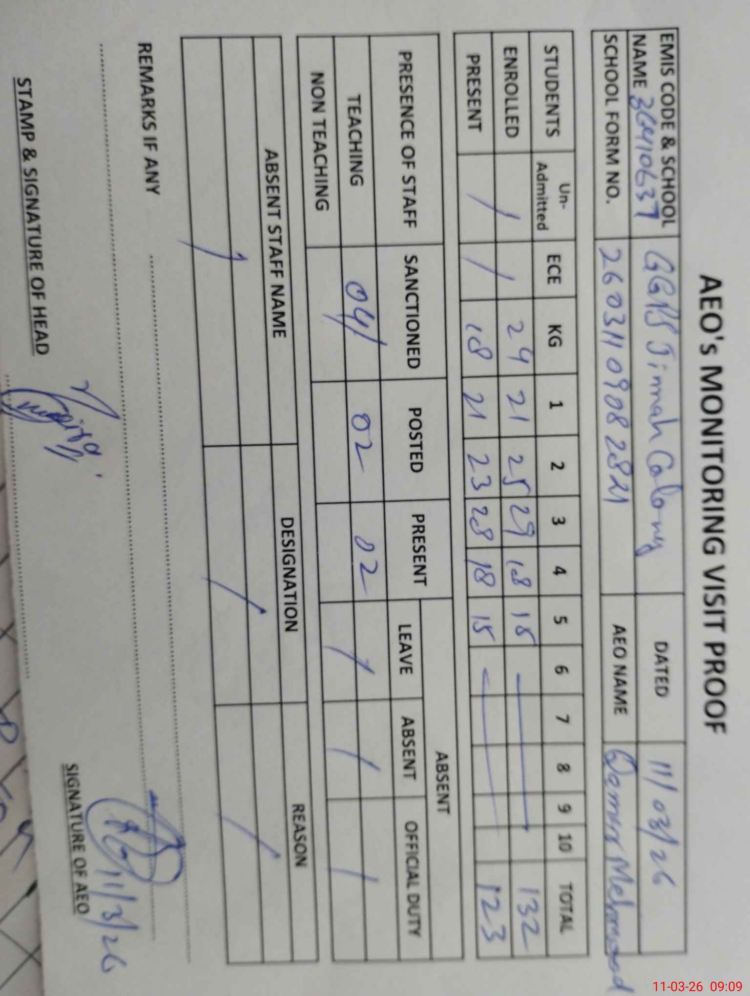 | Attendance Register | Head Teacher | MEA with School | Visit Proof |