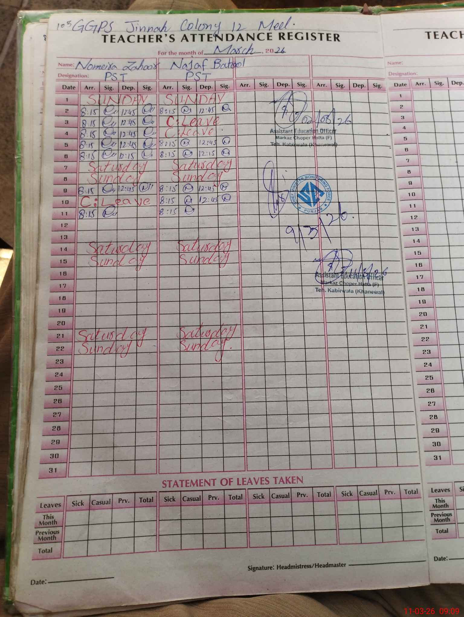 | Name: No**** Za**** Designation: (School Headmaster's/Headmistress's) PST Phone/Cell Number: 03**** |
