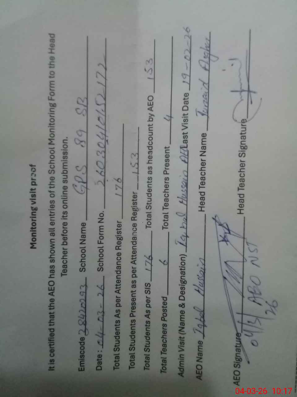 | Attendance Register | Head Teacher | MEA with School | Visit Proof |