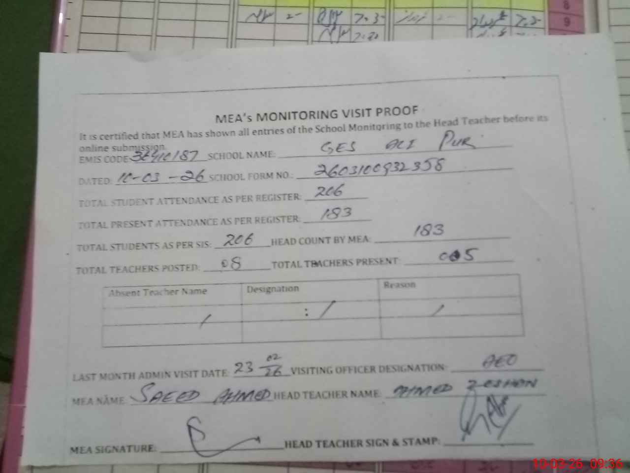 | Attendance Register | Head Teacher | MEA with School | Visit Proof |