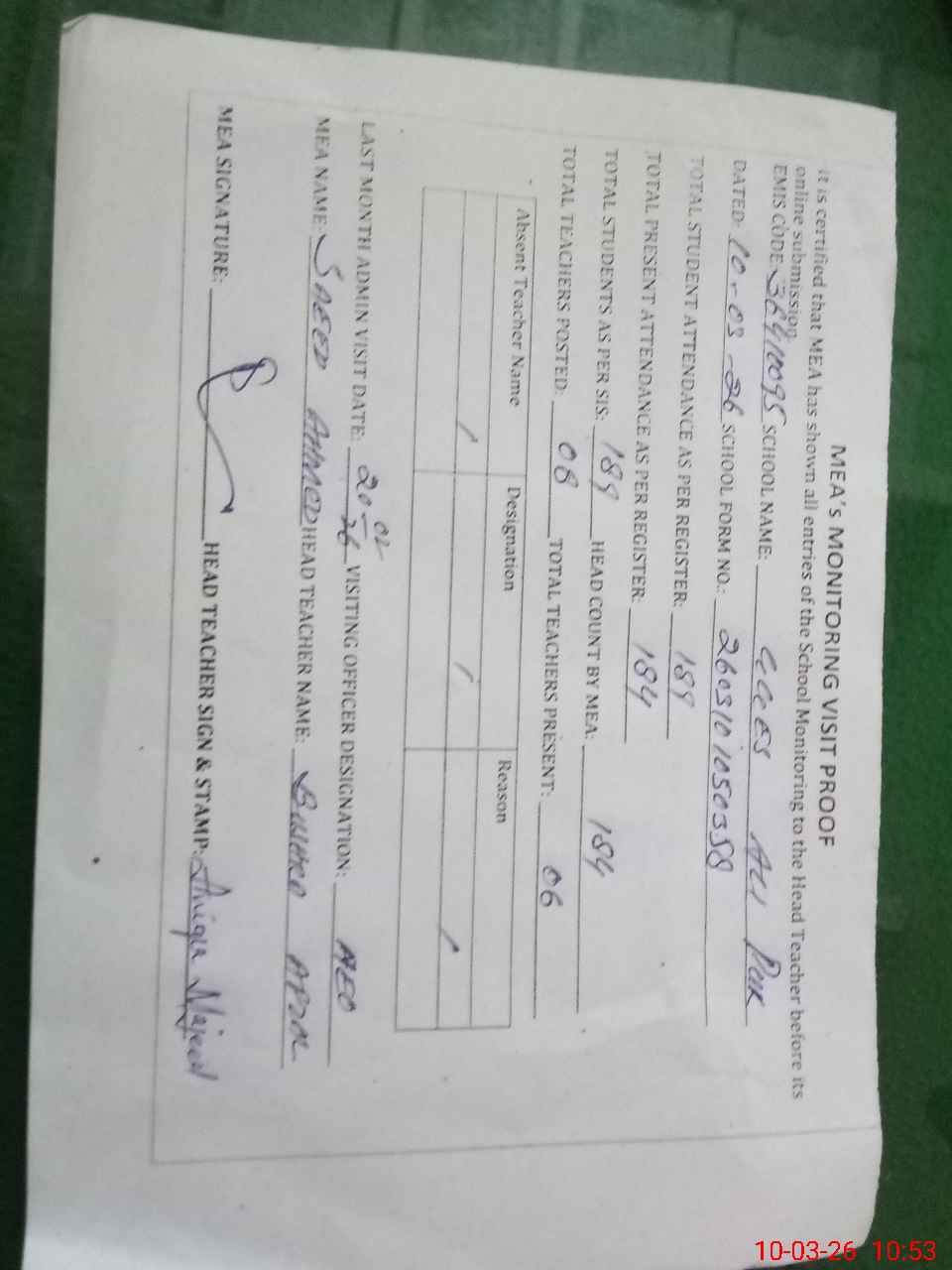 | Attendance Register | Head Teacher | MEA with School | Visit Proof |