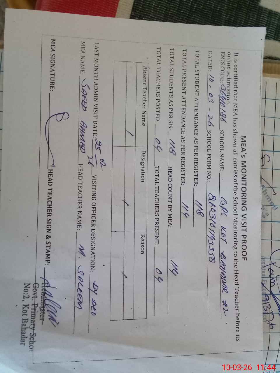 | EMIS Code: 36410186 | Name of School: GPS KOT BAHADUR NO.2 P/O MUBARAK PUR, KABIRWALA | |||