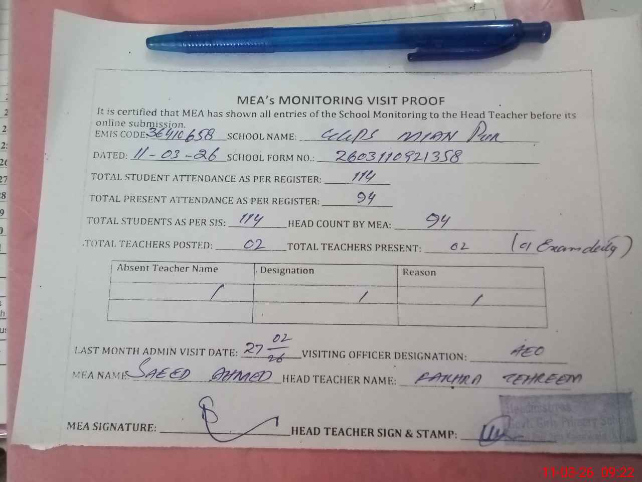 | Attendance Register | Head Teacher | MEA with School | Visit Proof |
