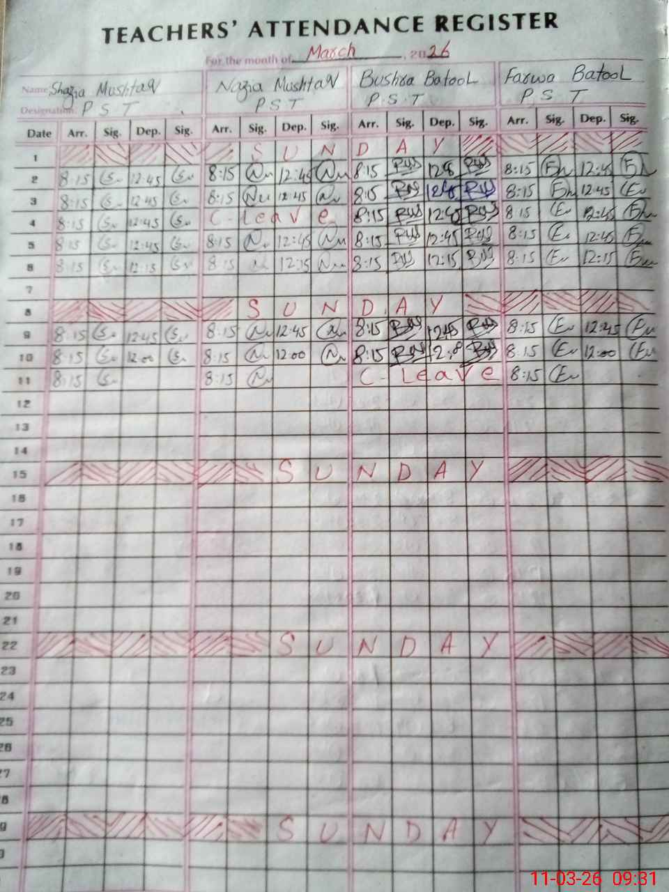 | 33**** | Bu**** Ba**** | PST Science/Maths | Regular | 1 | 0 | 0 | 0 | 0 | 0 | 0 | 0 | 1 | Absent (Un-Authorized) |