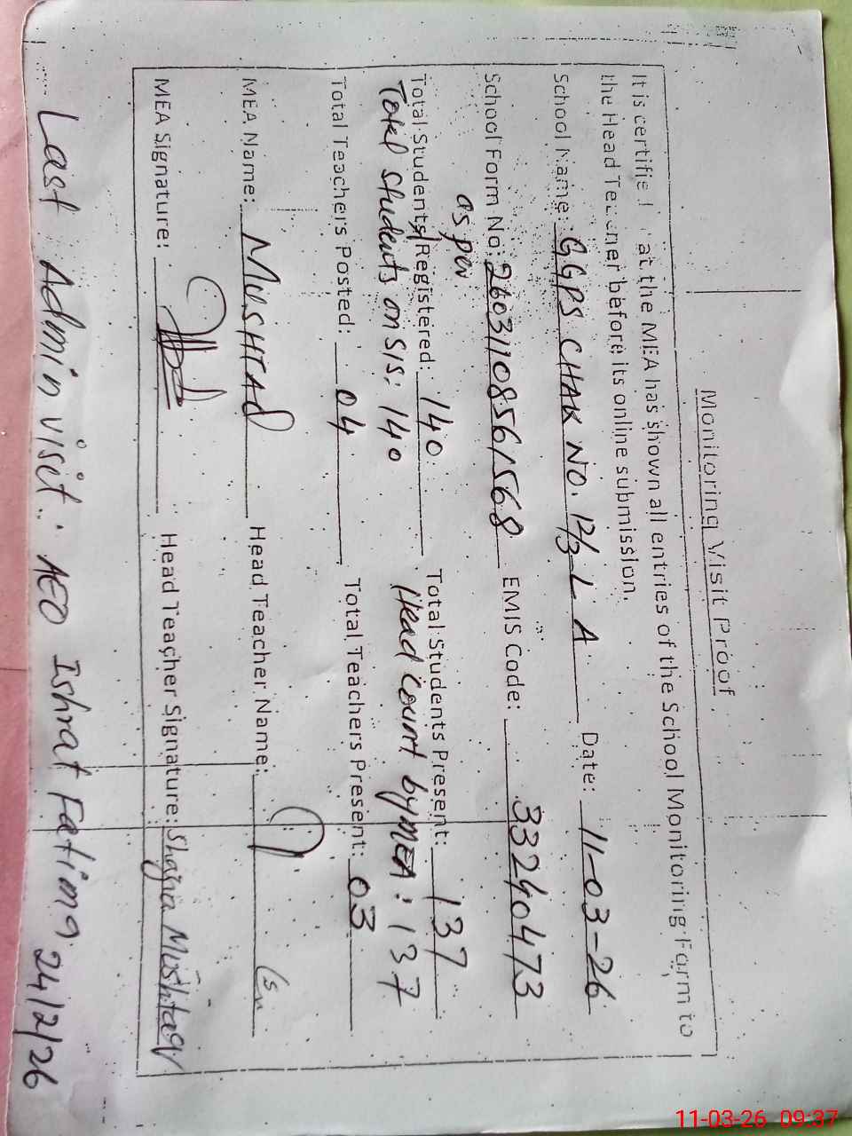 | Attendance Register | Head Teacher | MEA with School | Visit Proof |