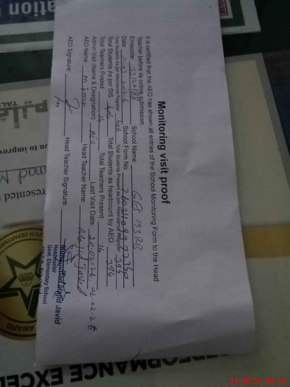 | Attendance Register | Head Teacher | MEA with School | Visit Proof |