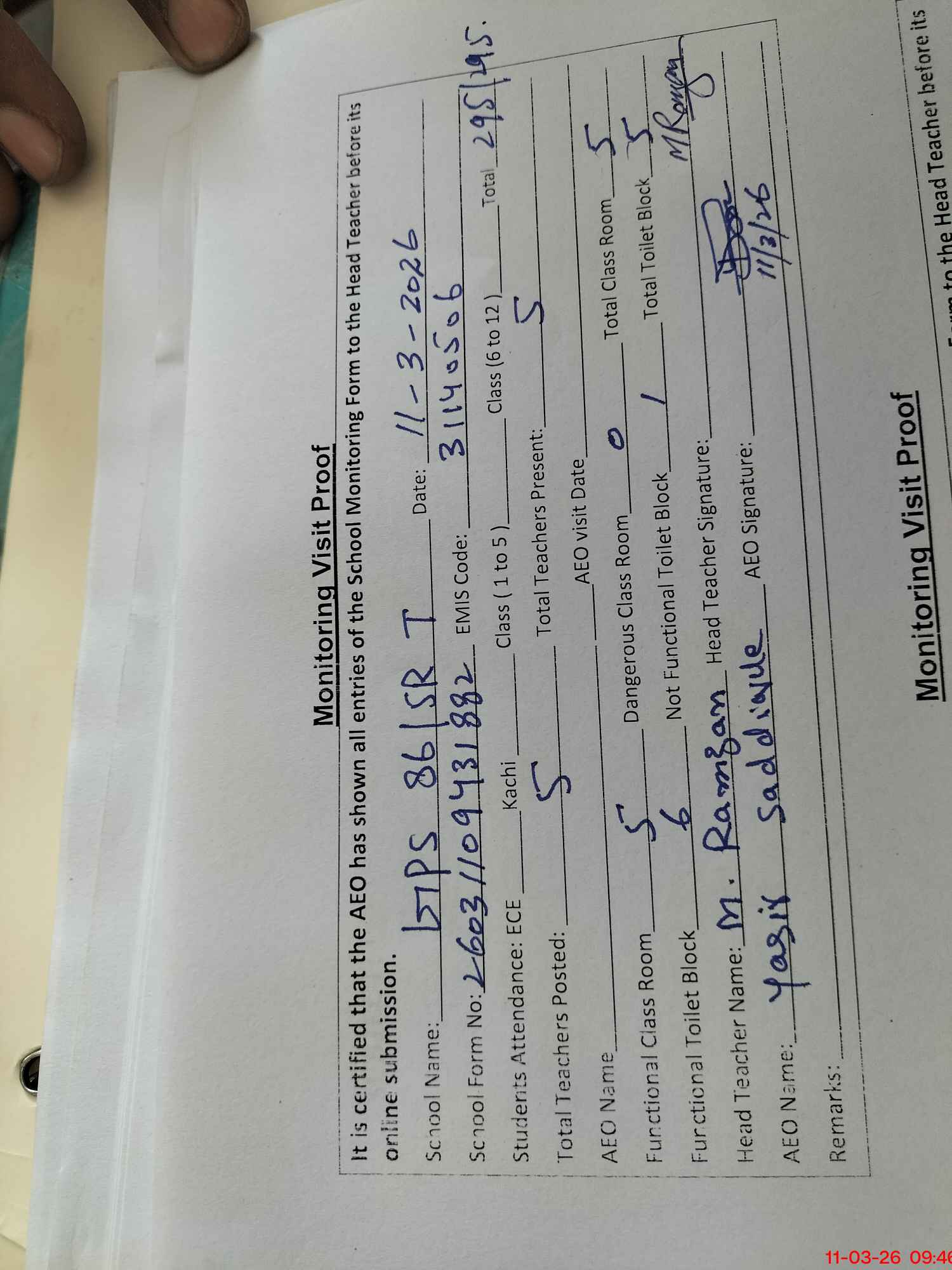 | Attendance Register | Head Teacher | MEA with School | Visit Proof |