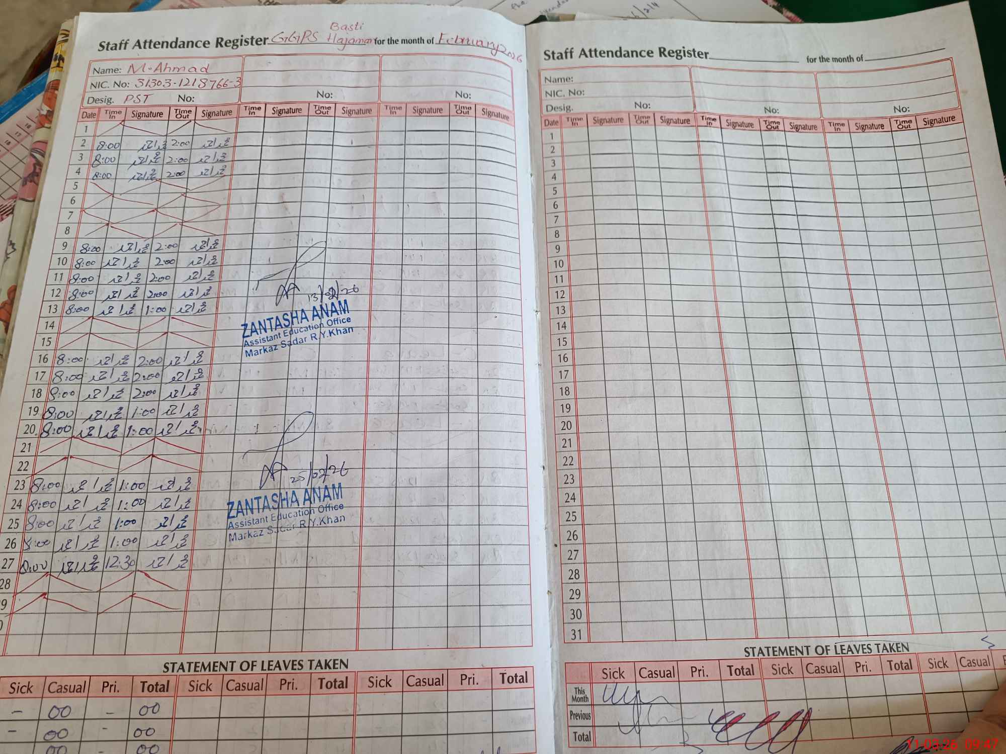 | CNIC | Full Name | Designation | R/C | Absence During Last Calender Month |