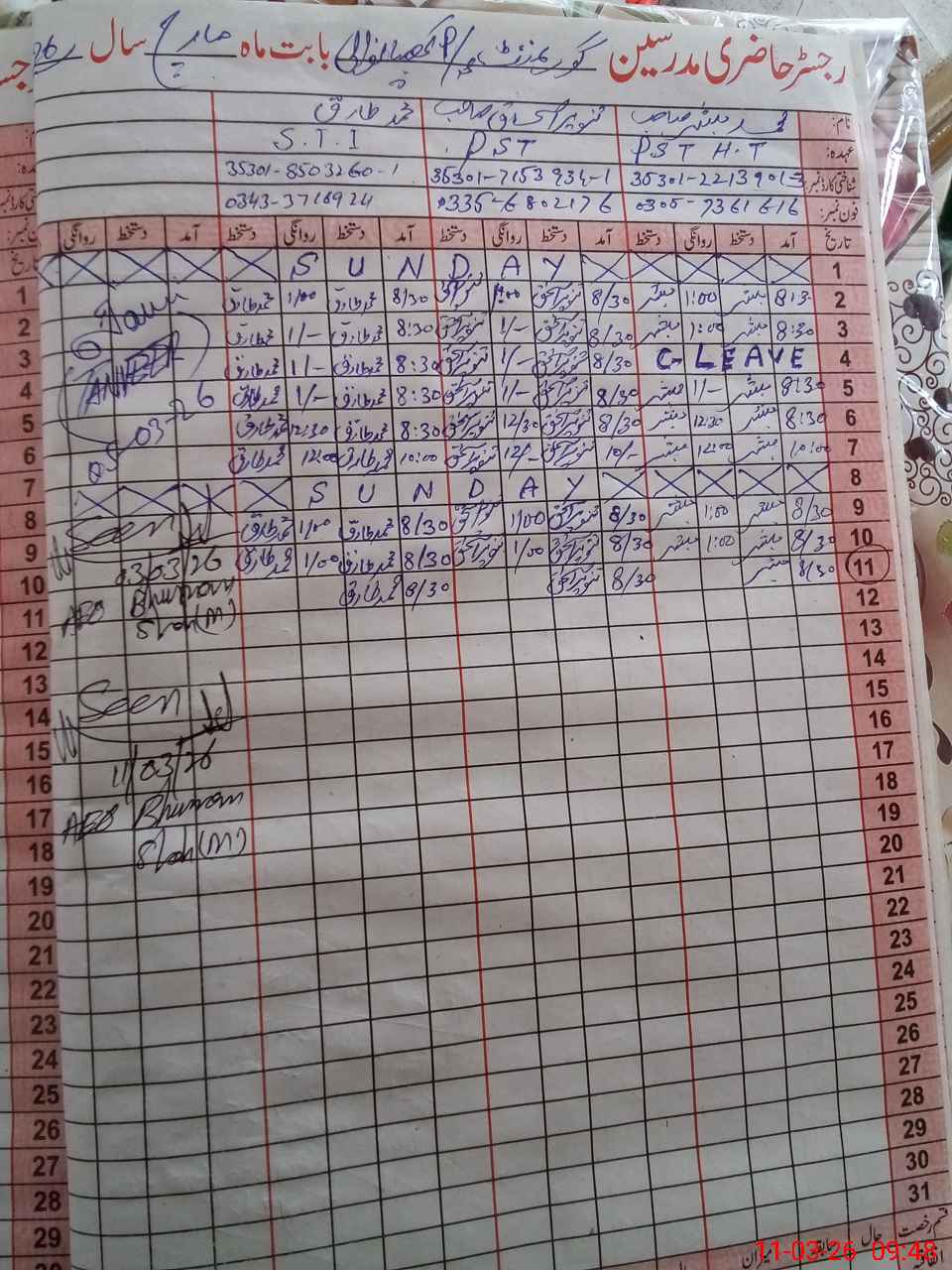 | CNIC | Full Name | Designation | R/C | Absence During Last Calender Month |