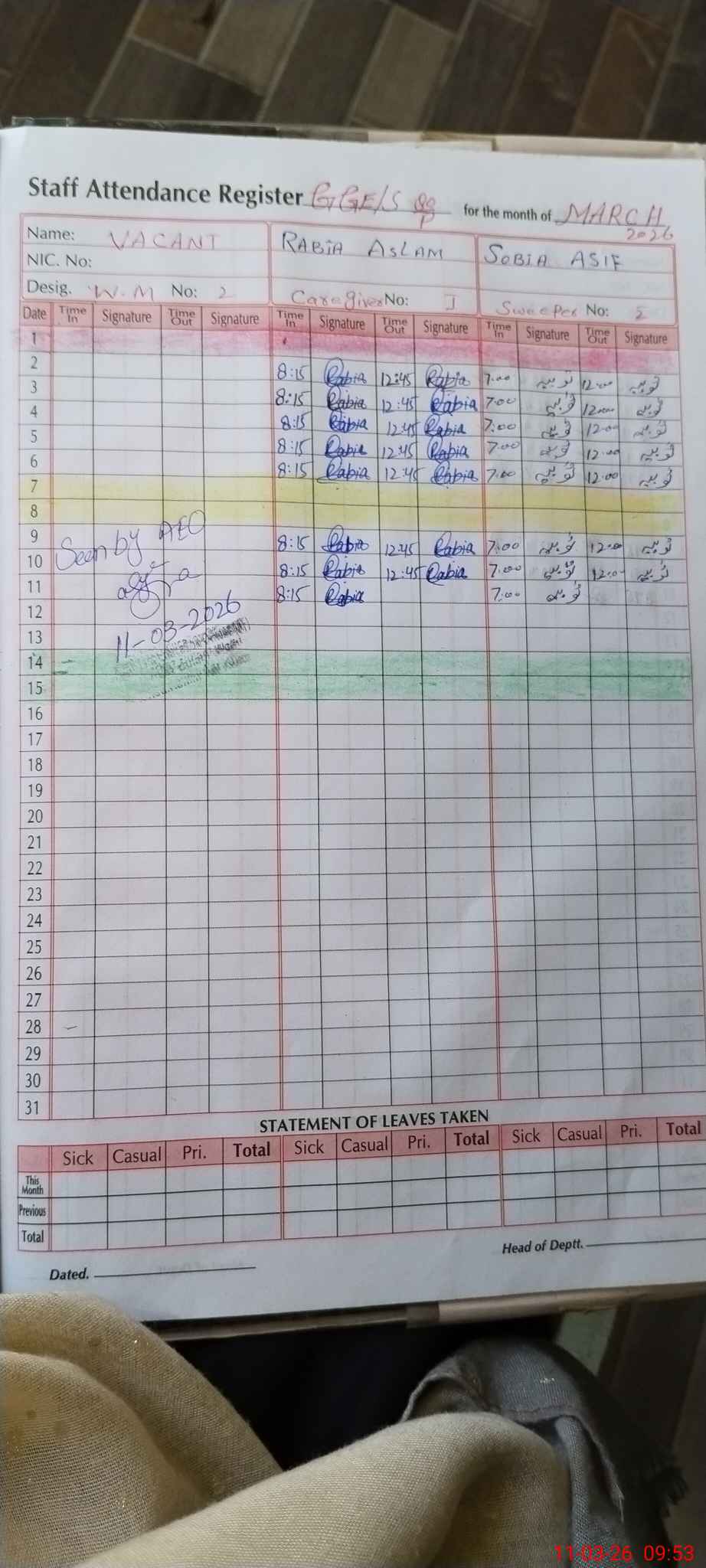 | Monitoring Date: 11-03-2026 | Start Time: 11-03-2026 09:33 AM | End Time: 11-03-2026 09:54 AM | Name of MEA: Ay**** Sa**** | |
