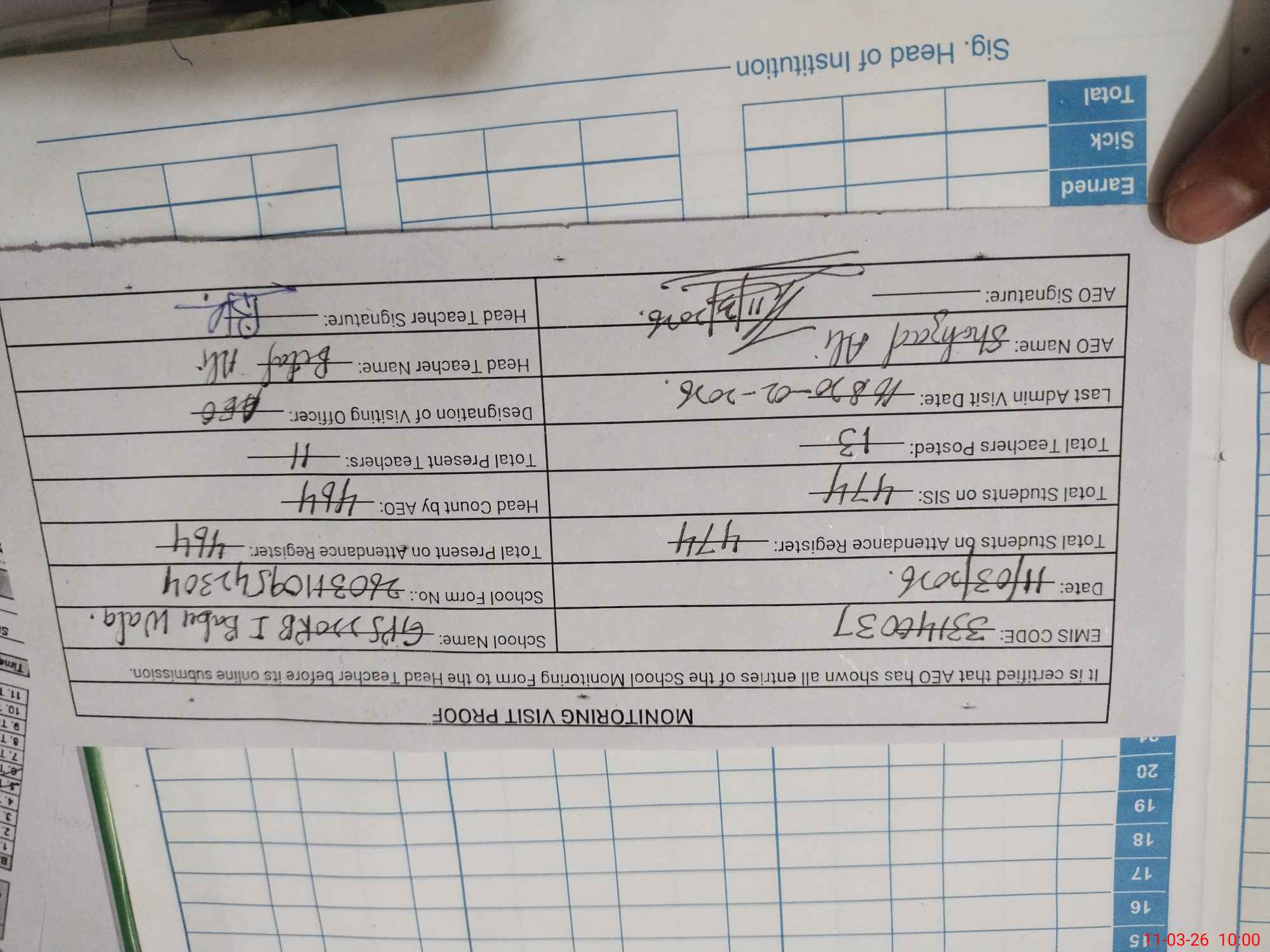 | Attendance Register | Head Teacher | MEA with School | Visit Proof |