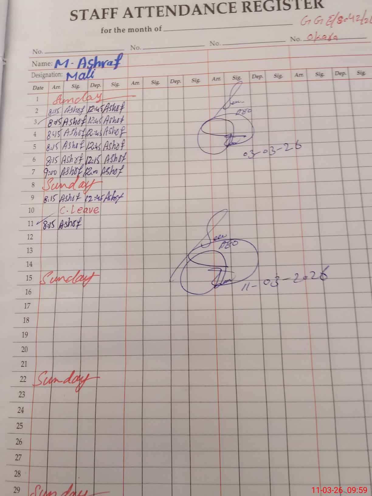 | CNIC | Full Name | Designation | R/C | Absence During Last Calender Month |