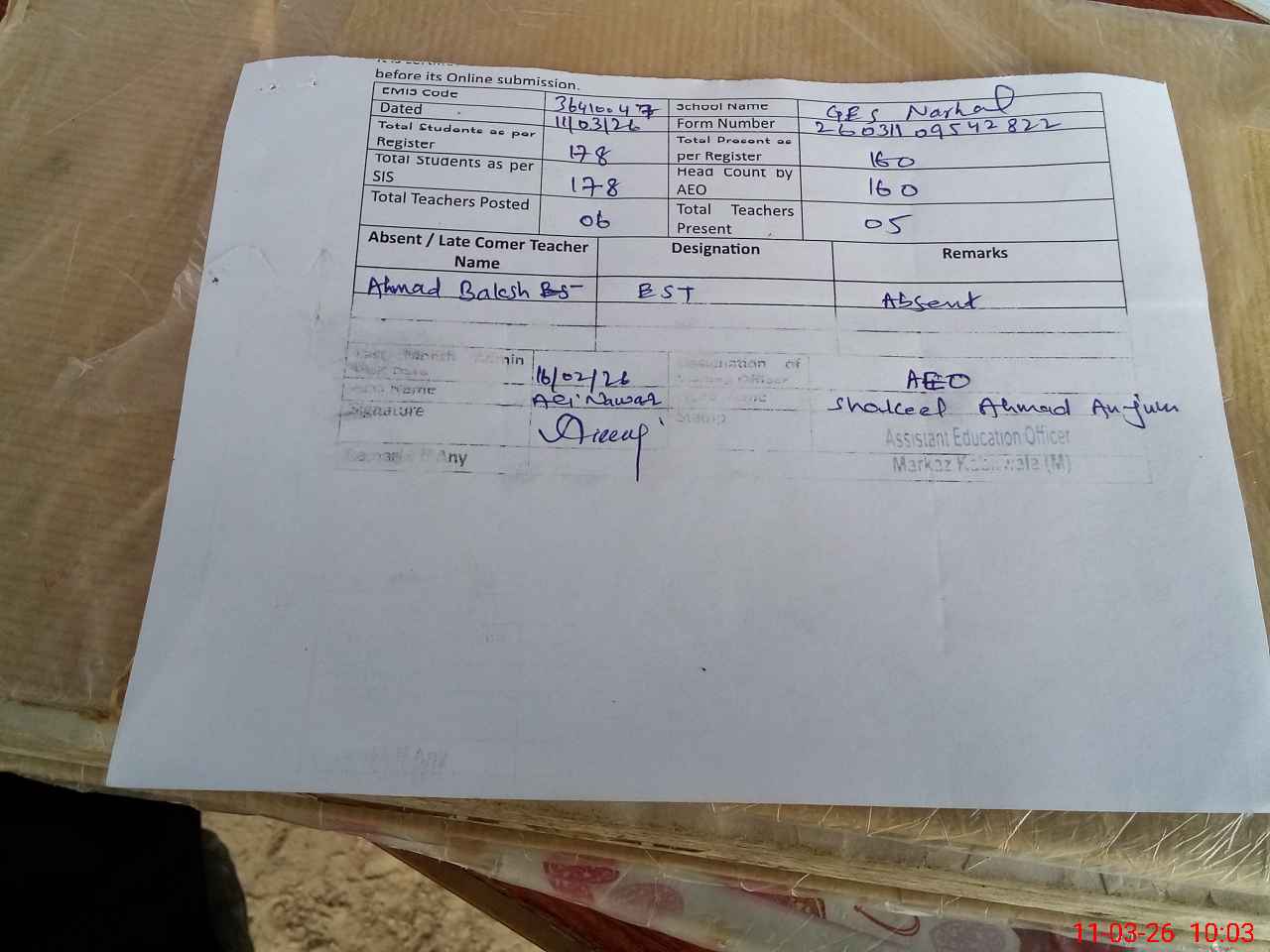 | Remarks (Use Separate Page if Required): Mr Ahmad Baksh EST is absent. | |||||