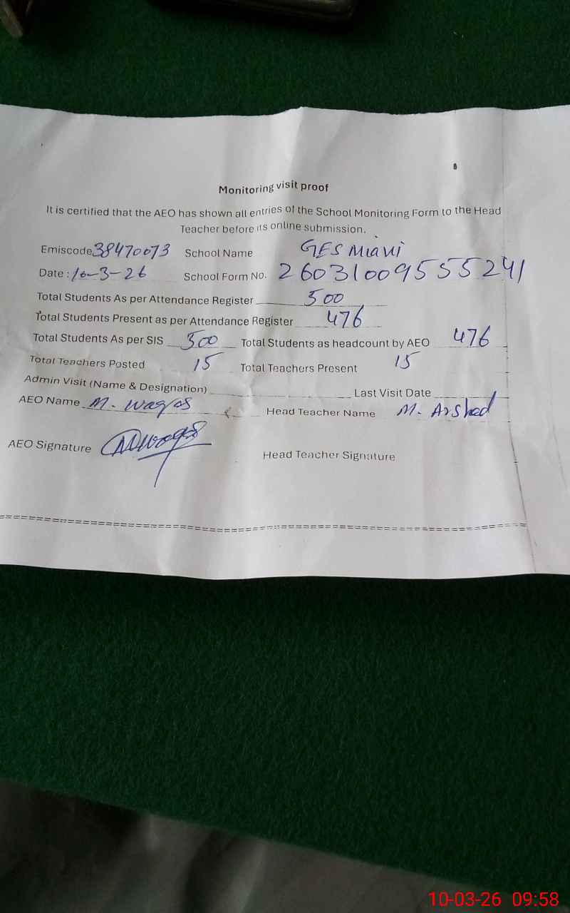 | Attendance Register | Head Teacher | MEA with School | Visit Proof |