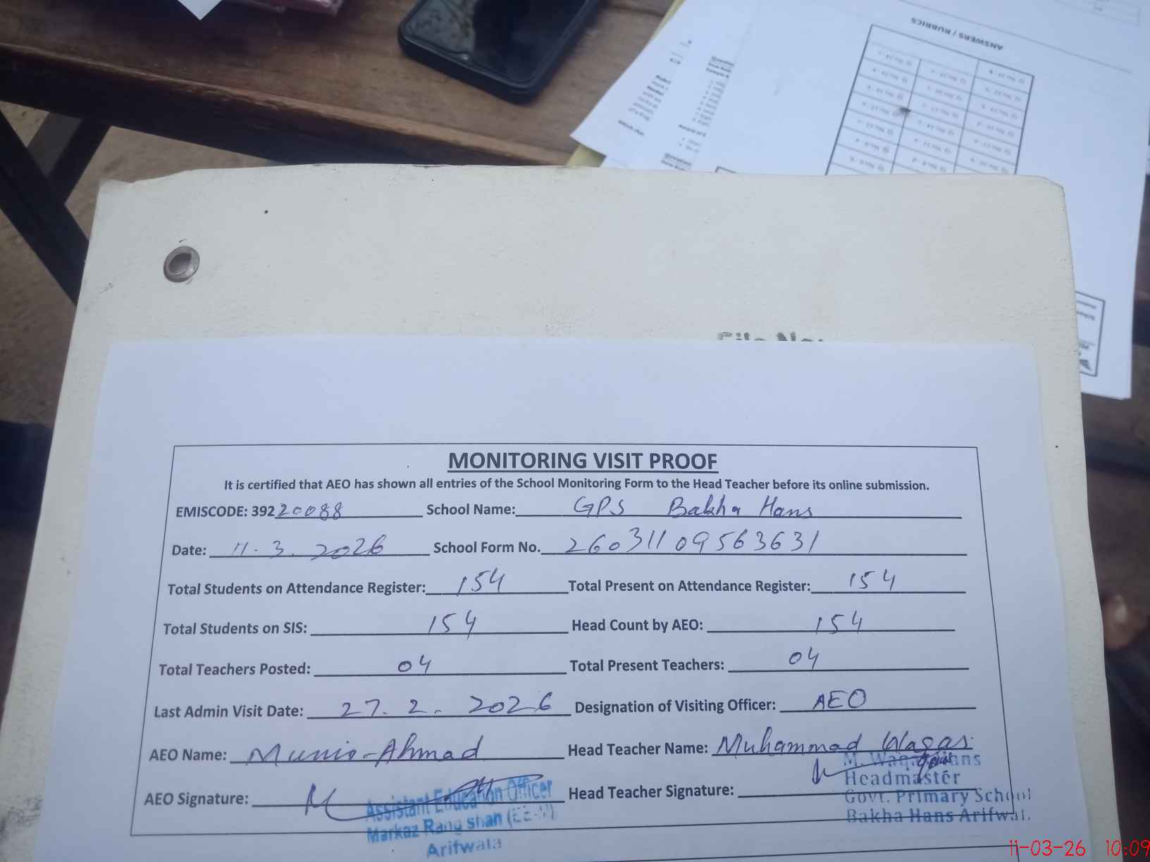 | Attendance Register | Head Teacher | MEA with School | Visit Proof |