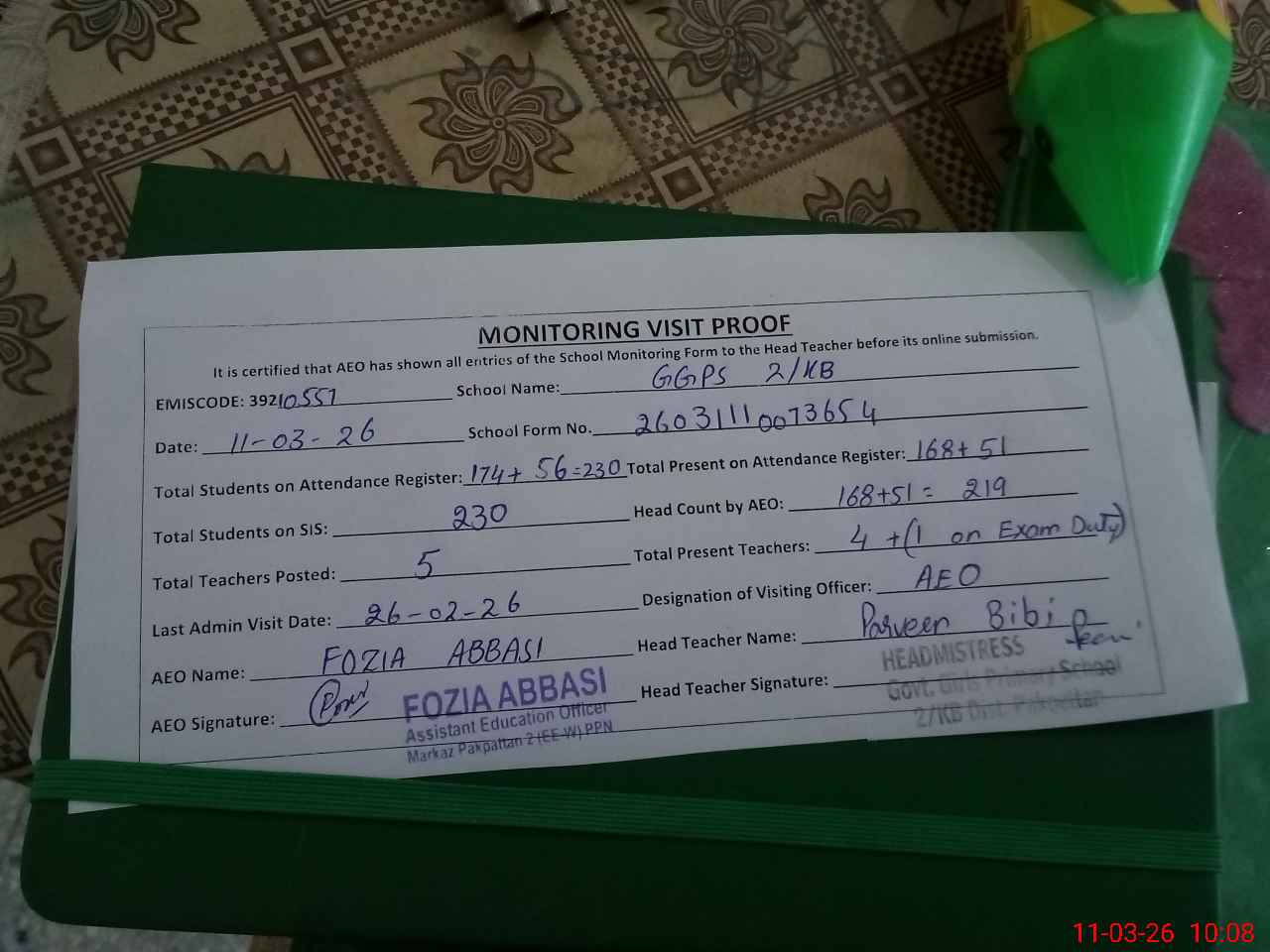 | Attendance Register | Head Teacher | MEA with School | Visit Proof |