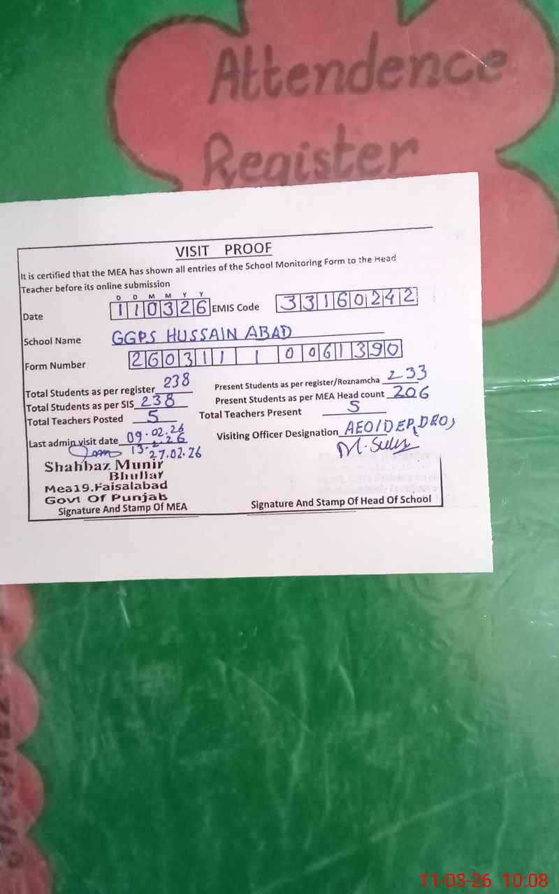 | EMIS Code: 33160242 | Name of School: GGPS HUSSAIN ABAD TANDLIANWALA | |||